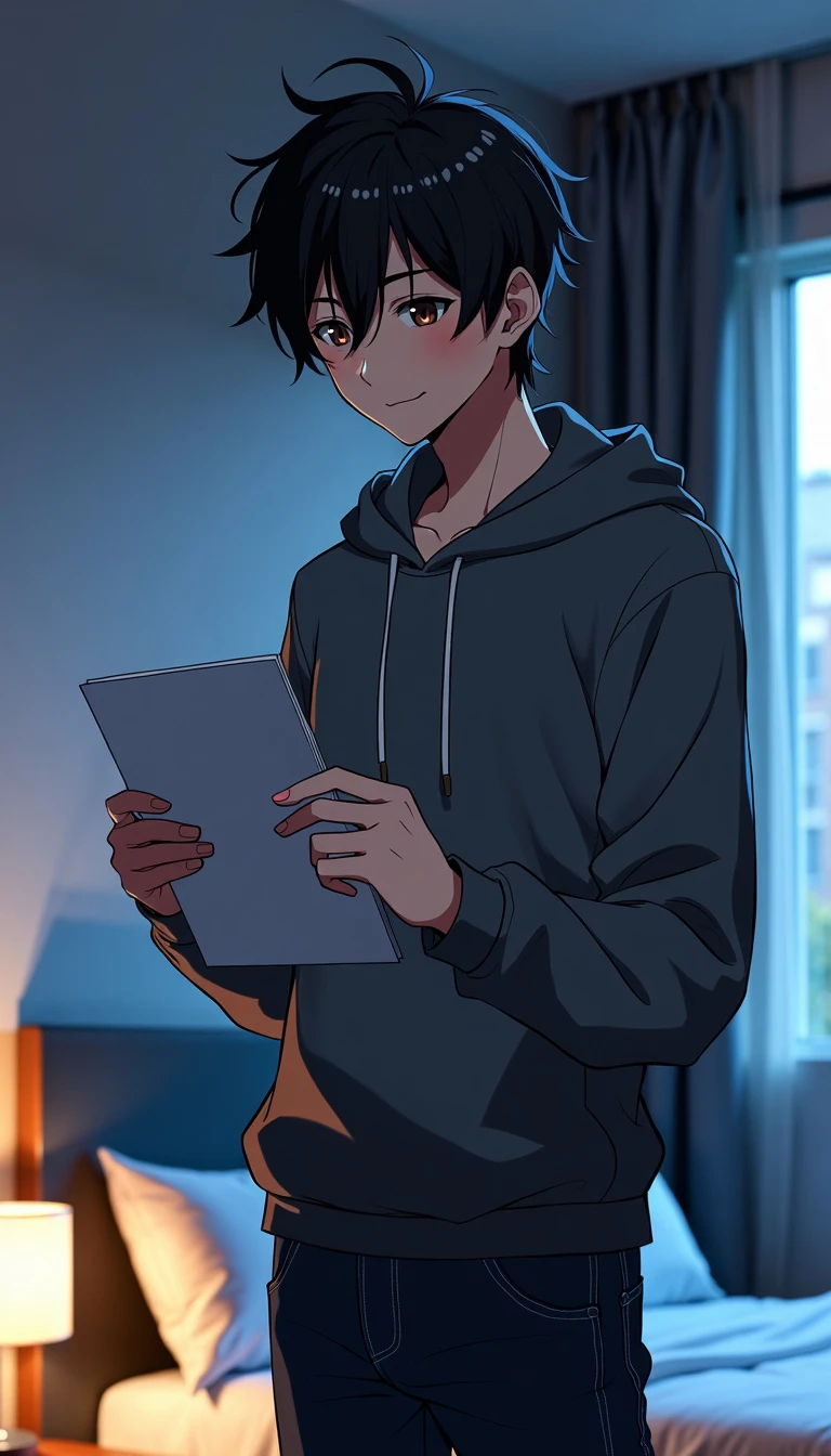 Modern Anime Style, A sleek, modern room with cool tones of gray and dark blue, illuminated by a small bedside lamp emitting a soft white light. A close-up shot of Yuji, standing at 5'11" with a lean, athletic build and lightly tanned skin, as he reads the invitation in his hand. His sharp coffee-brown eyes widen slightly with excitement, and his thin lips curve into a small grin. His jet-black, tousled hair falls slightly over his forehead, casting a soft shadow on his face. His well-defined facial features—straight nose and strong jawline—are illuminated by the soft white light of his room. He wears a simple charcoal-gray hoodie, dark blue slim-fit jeans, and black sneakers with white soles. The envelope and the open invitation are visible in his hands. Behind him, the room is softly lit, with cool gray and blue tones creating a sleek, modern atmosphere.