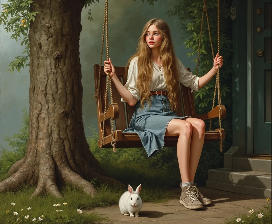 Style of Albrecht Altdorfer, her hair is long and dark blonde, she has blue eyes, she is sitting on a porch swing that is hung from a tree and there are rabbits on the ground near the swing, she wears casual clothes that are fashionable in the 2020s,