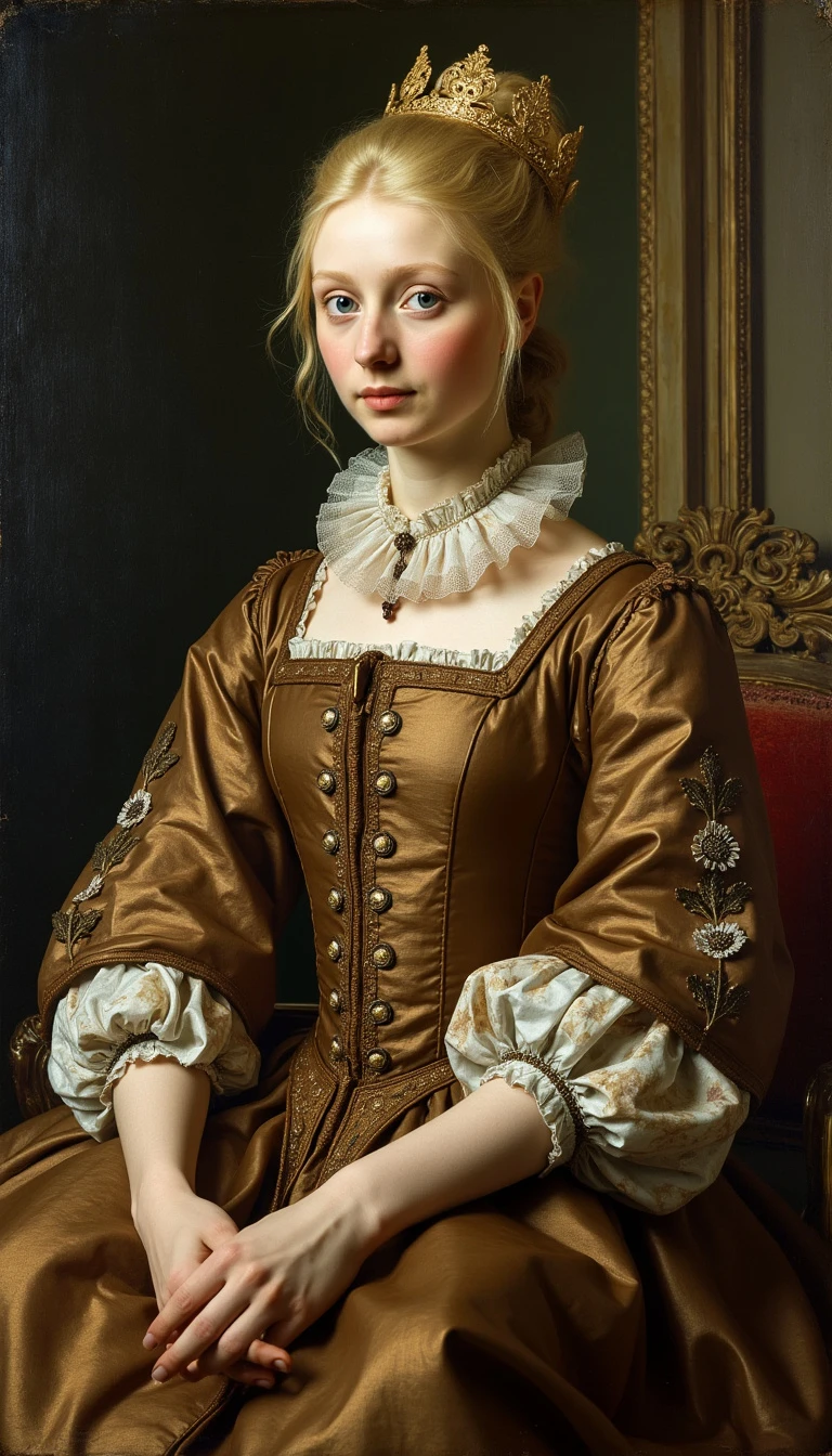 Style of Giuseppe Arcimboldo, Renaissance-style painting, woman of noble Swiss birth, she has blonde hair in a style common for Swiss nobles during the Renaissance, her clothes are very expensive and well made, her clothes are made of the finest materials used during the Renaissance, her eyes are a dark blue, she is sitting on a well made piece of Swiss furniture from the Renaissance and the rest of the room is of typical room for a Swiss noble, she appears to be in love with the artist,