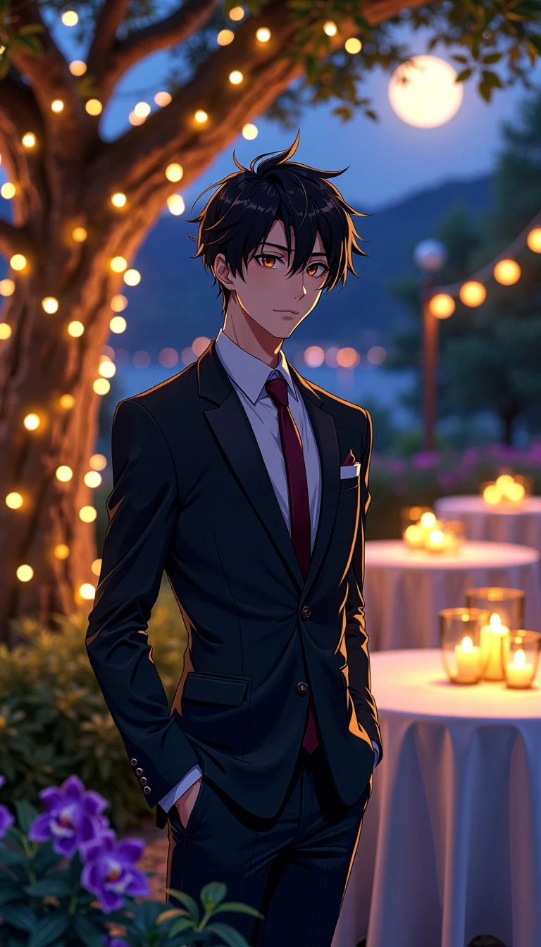 "Modern anime style" "A close up shot of Yuji, standing at 5'11" with his lean, athletic build, "is standing with two of his friends near the edge of the venue, under a large tree wrapped in twinkling lights". His lightly tanned skin contrasts subtly with the dark evening setting, while his jet-black, slightly tousled hair catches the soft light. His dark coffee-brown eyes scan the venue with an observant, composed expression, while the soft moonlight adds definition to his sharp facial features—his straight nose, strong jawline. His black tuxedo stands out against the dark night, and the maroon tie he wears complements the warm glow of the lanterns around him. His friends, both men, are similarly dressed in formal dark suits. The cool evening breeze rustles the leaves, and in the background, tables with ivory linens and golden candle-lit centerpieces can be seen, casting a soft, romantic glow over the garden. The moonlight filters through the trees, enhancing the serene, magical atmosphere of the night. surrounded by purple orchids and lavender flowers, enhancing the tranquil ambiance in the moonlight garden"