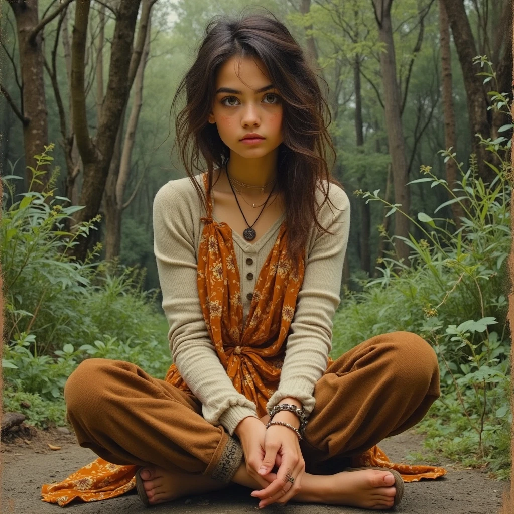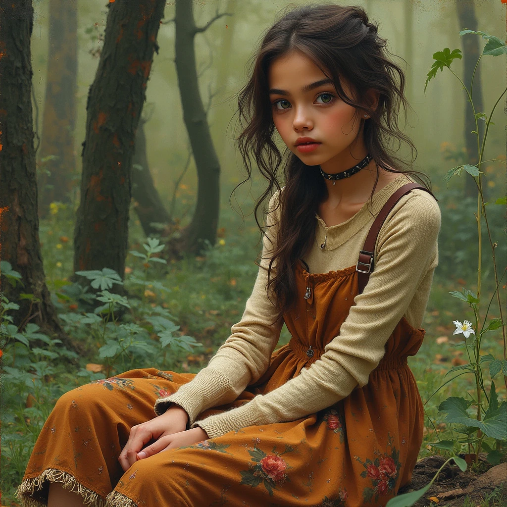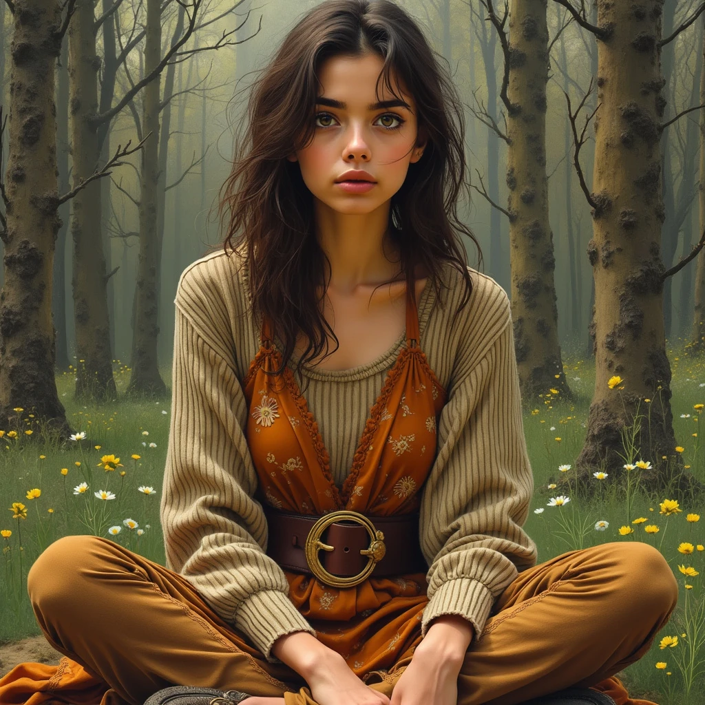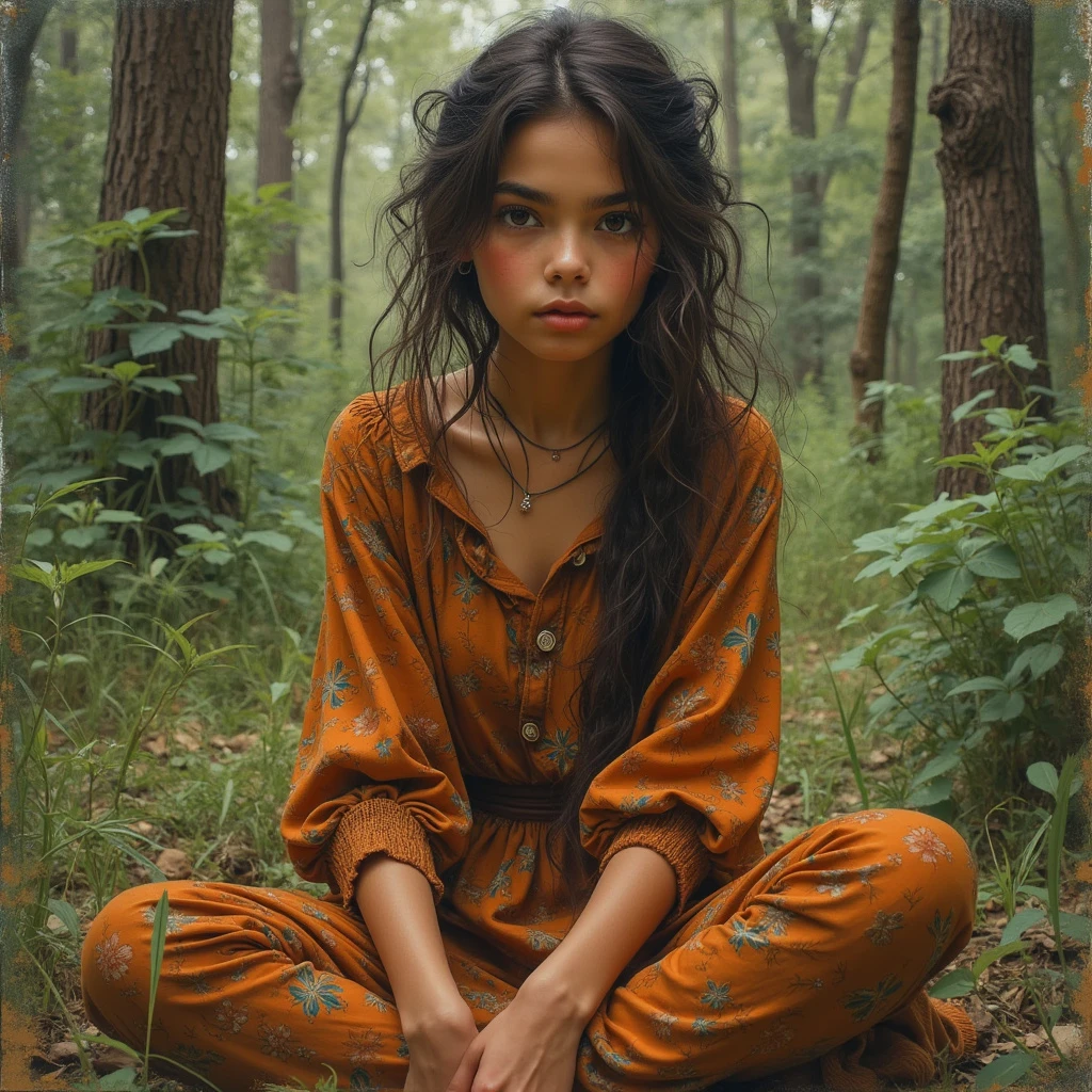 triptych style, by Ata Kandó. Style of Élise L'Heureux. Painting. Oil Pastel. A 18 year old with latina features. Tan. Shadaria Kalil is petite. She is thin but scrappy. A vagabond with thick bushy eyebrows and slightly unkempt brown hair. She has olive green eyes. She is very earthy and dressed in a scrappy style. She is a Wiccan. She wears a long sleeved ribbed top, with a burnt orange floral dress over top. She wears brown burlap pants, and moccasins. Sitting in a outside in the forest.