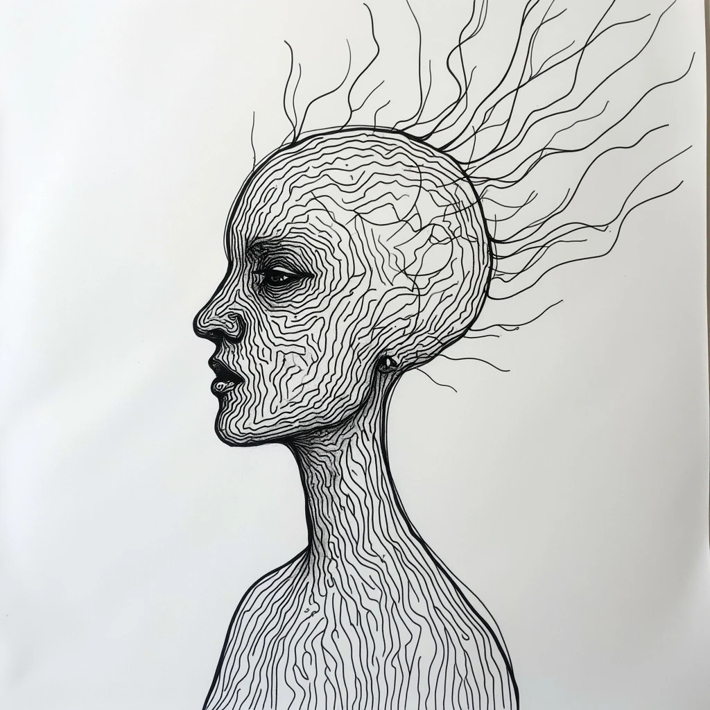 A minimalist, one-line drawing of the surrealistic abstract impression of thinking made with multiple flowing lines