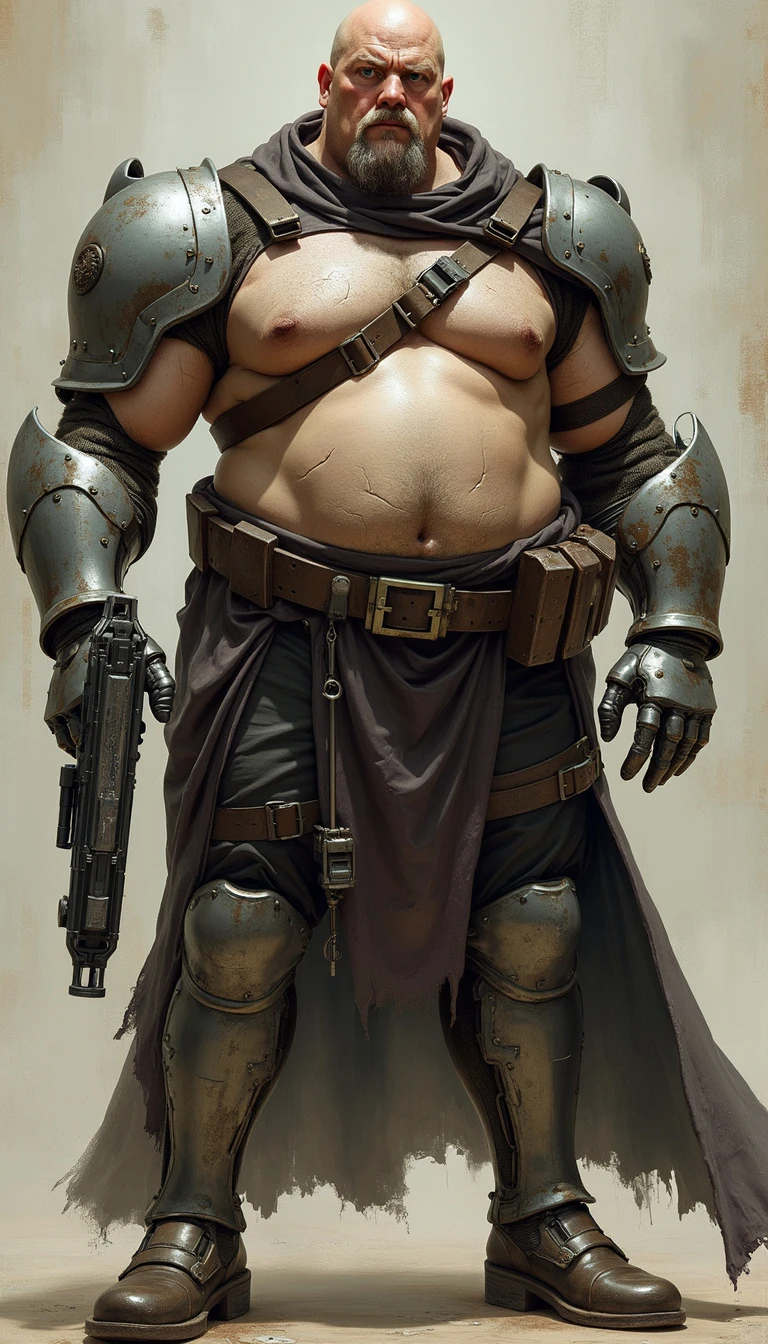Full body fat male villain character, bionic prosthesis hand and leg, body armor made of thick iron with scratches and dents, huge gun.