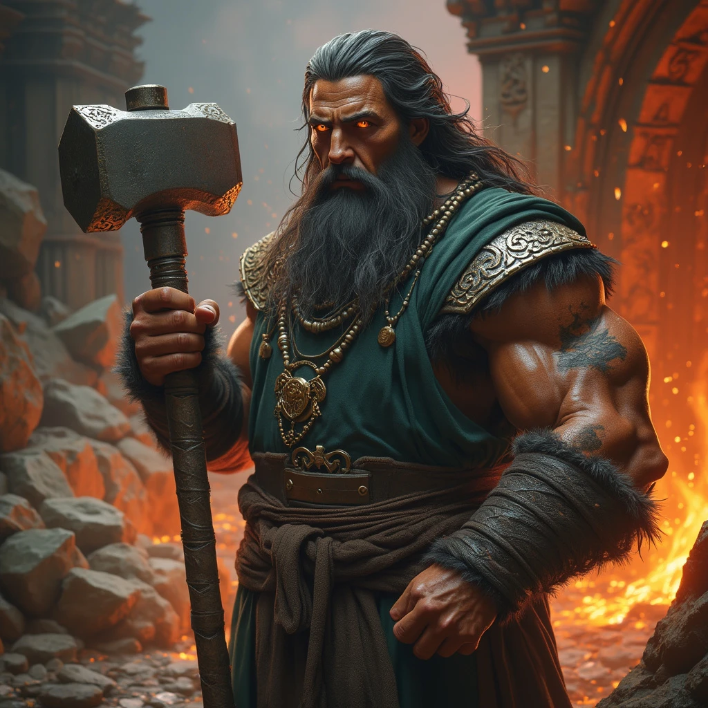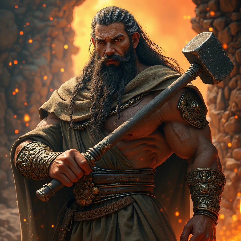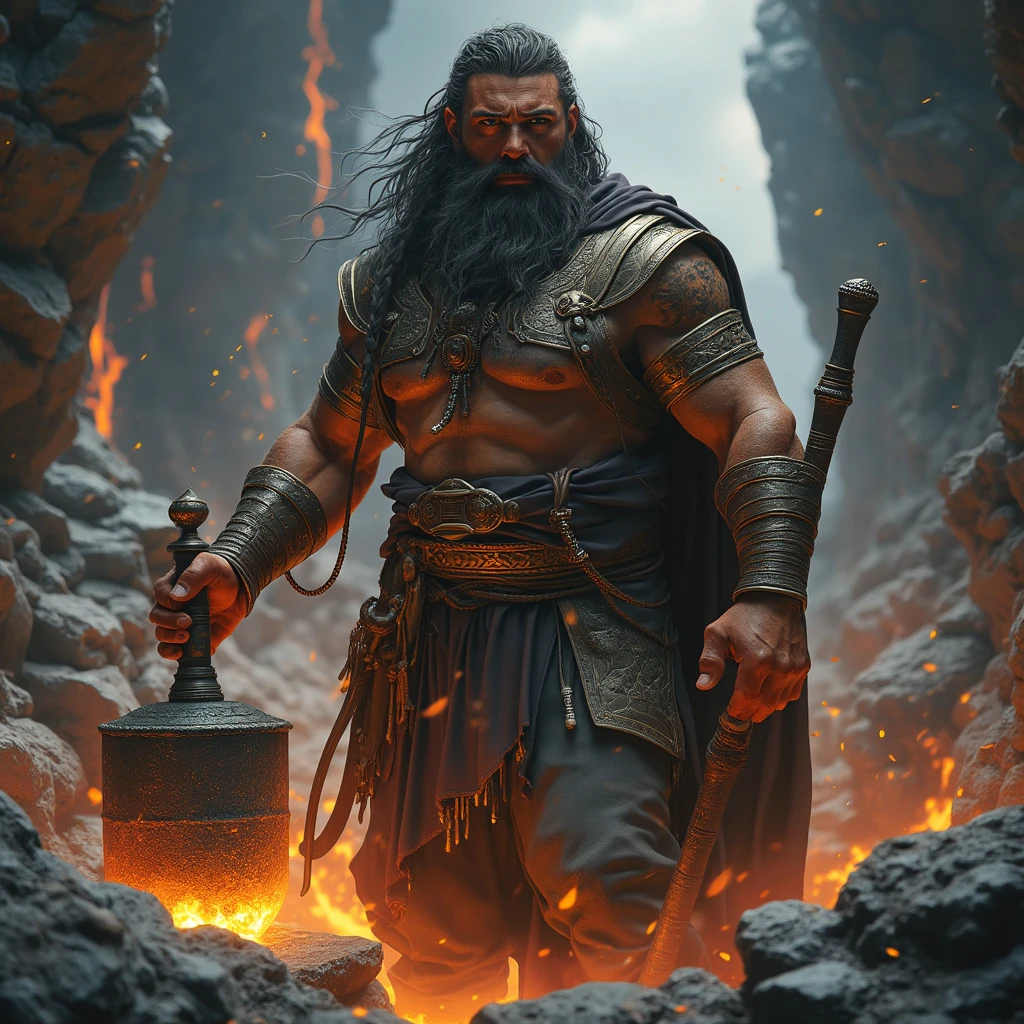 Create an image of Aulë, the Vala of craftsmanship and the master of all things made of the earth in JRR Tolkien's The Silmarillion, in a realistic and powerful style. Aulë is a robust and resilient figure, with a robust and muscular build that reflects his tireless work as a master blacksmith and craftsman. His skin has the texture of rough stone and the color of rich, dark earth, as if he himself had been carved from the same materials with which he works. His hair is thick and dark, with silvery streaks like veins of precious metal running through the ore, and his beard is long, braided, and speckled with particles of dust and metal. His eyes burn with the orange glow of molten lava, filled with deep focus and passion for his craft. He wears simple but well-crafted robes, adorned with intricate patterns and metallic details, which shine with the beauty of forged metals. In one hand he holds a massive hammer, the tool of his trade, its surface worn from centuries of use but still shining with the skill of its creator. His presence exudes the power of creation, surrounded by the symbols of his work—tools, jewelry, and unfinished masterpieces, with molten metal flowing in the background, radiating heat and light from his forges,hyperdetalied,ultrarealistic,4k