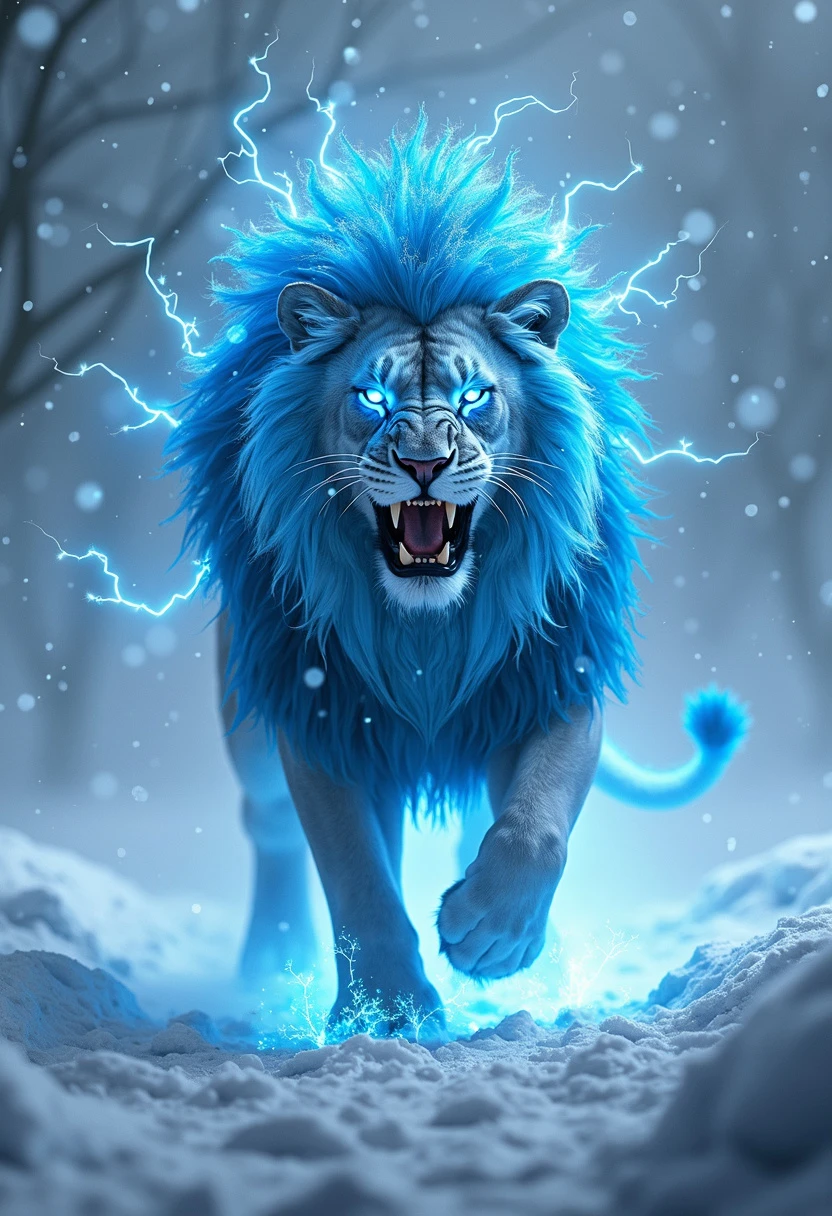 A photorealistic electric blue lion with glowing fur and a majestic, flowing mane, stands roaring amidst a swirling white blizzard. The lion's body is muscular and detailed, with the electric blue fur contrasted sharply against the bright, detailed snowstorm. The mane appears to be made of crackling electric energy, with individual strands of blue light radiating outward. The lion’s glowing blue eyes are fierce and intense, directed slightly upward as it roars into the storm. The snowflakes are sharp, crisp, and highly detailed, swirling chaotically around the lion, with some snowflakes being caught in the mane and melting upon contact with the electric energy. The background is a vast, blinding white blizzard, with occasional faint blue hues blending into the storm. The ground is covered in thick, untouched snow, with some paw prints leading toward the lion. There is a subtle glowing white mist around the lion’s paws, and the overall lighting is soft yet cold, with the electric blue hues of the lion adding a surreal, otherworldly glow against the white backdrop.