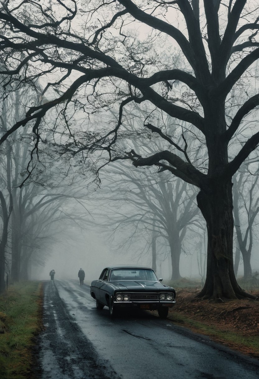 Capture the serene beauty of early morning mist enveloping a wet muddy road, with a vintage car parked nearby. A man in a (dapper suit:1.2) and (classic hat:1.3) stands under a (majestic tree:1.1), as the sun peeks through the fog. Emphasize (cinematic frames:1.4), soft lighting, and (dreamy atmosphere:1.2). Inspired by the works of (Gregory Crewdson:1.5) and (Andreas Gursky:1.3).