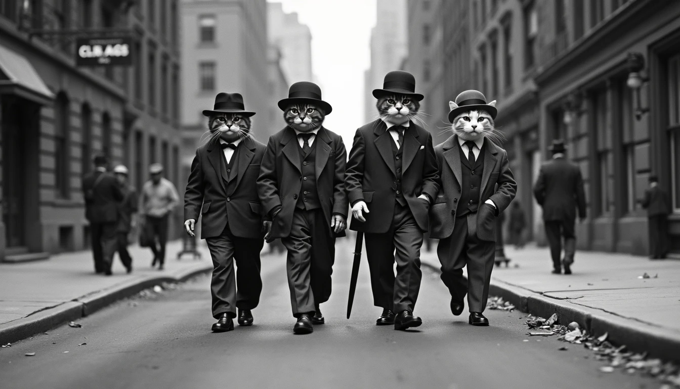 An anthropomorphic cats gangsters walking down the street of Chicago 1930s.