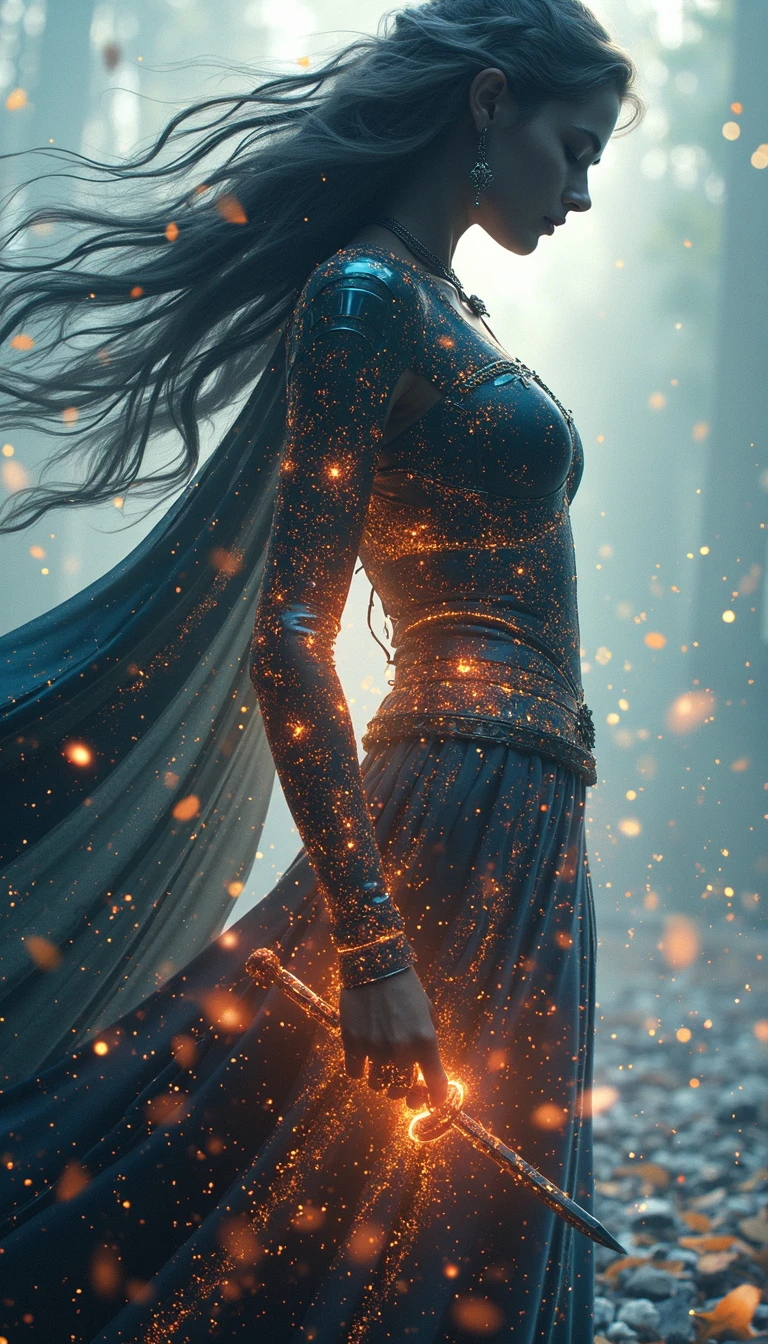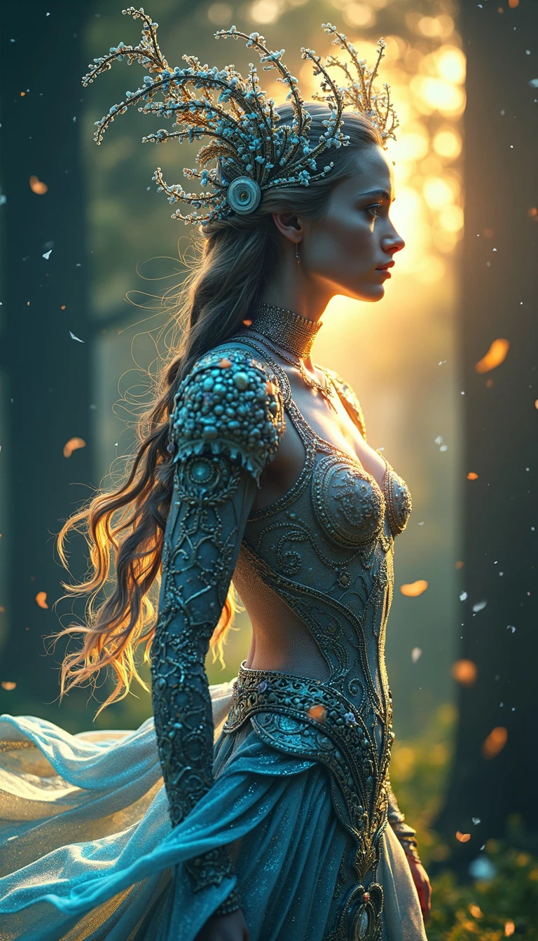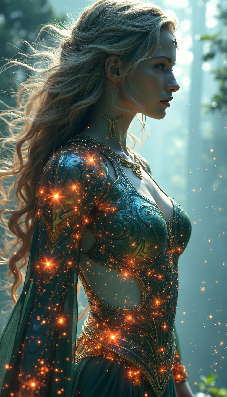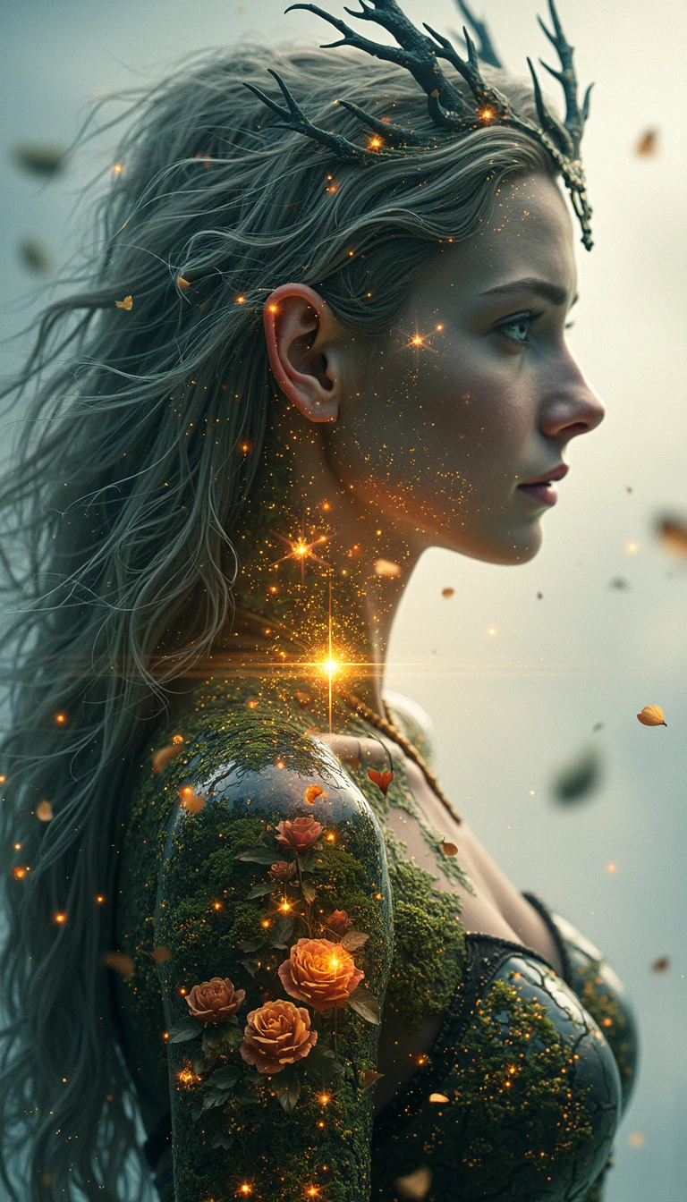 # Improved Prompt for Freya Artwork ## Opening Instruction: "Create a mesmerizing and multifaceted 8K resolution 3D double exposure artwork featuring Freya, the goddess of love, beauty, war, and magic. The primary image should be a graceful yet powerful silhouette of Freya, blending traditional Norse elements with advanced holographic and nanotech aesthetics. Within this silhouette, seamlessly integrate a secondary image of a lush, otherworldly battlefield-garden, emphasizing the duality of love and war." ## Primary Image (Freya): - Overall Appearance: Depict Freya as a stunning, shapeshifting figure transitioning between warrior and enchantress, her expression a mix of allure and fierce determination. - Attire and Accessories: Clad her in flowing, iridescent armor that seems to be made of liquid light and shadow, morphing between battle gear and elegant robes. Her necklace, Brísingamen, should appear as a collar of miniature stars. - Symbolic Elements: Incorporate her boar, Hildisvíni, as a shimmering force field around her. Her falcon cloak should be a mantle of swirling nanobots that can form wings. - Texture and Materials: Suggest a mix of fluid, light-refracting surfaces that shift and change with her movements, never fully solid or liquid. - Body Composition: Render Freya's form as a swirling cosmos of love and war, with hearts and weapons forming constellations within her being. ## Secondary Image (within the silhouette): - Setting Description: Within Freya, reveal a paradoxical landscape where a lush, magical garden intertwines with a raging battlefield. Flowers bloom from broken swords, and love letters float amidst arrow volleys. - Key Elements: Include her hall, Sessrúmnir, as a grand structure that shifts between a palace of love and a fortress of war. Show fallen warriors rising to become flowers or trees. - Dynamic Components: Animate gentle breezes carrying flower petals that transform into shimmering sparks of battle as they swirl through the scene. - Symbolic Integration: Weave Norse symbols of love and war throughout the landscape, with runes forming pathways and clearings. ## Color Palette and Lighting: - Primary Colors: Soft rose golds and deep crimsons for Freya's form, symbolizing love and bloodshed. - Secondary Colors: Lush greens and earthy browns for the garden elements, contrasted with steely grays and flame oranges for battle scenes. - Lighting Effects: Implement a dynamic lighting that shifts between warm, romantic glows and harsh, dramatic battle illumination. - Texture and Finish: Contrast soft, velvety textures of flowers and skin with the hard, metallic surfaces of weapons and armor. ## Composition and Style: - Overall Layout: Structure the composition as a yin-yang of love and war, with Freya at the center as the balancing force. - Focal Points: Emphasize Freya's captivating eyes, her necklace Brísingamen, and the central point where garden and battlefield merge. - Style Integration: Blend traditional Norse art styles with futuristic holographic displays and nanotech swarm formations. - Depth and Dimension: Create layers of reality within Freya, with the garden-battlefield existing in a pocket dimension inside her form. ## Emotional Impact and Mood: - Key Emotions: Evoke a complex mix of desire, admiration, unease, and respect, reflecting Freya's multifaceted nature. - Atmospheric Elements: Surround Freya with an aura that shimmers between soothing pink mists and ominous war drums. - Contrasting Elements: Juxtapose symbols of love and peace with instruments of war and chaos throughout the composition. ## Technical Considerations: - Level of Detail: Render Freya's face and Brísingamen with intricate detail, while keeping the transforming elements more fluid and abstract. - Texture Mapping: Apply a subtle, animated texture that shifts between floral patterns and battle maps across Freya's form. - Special Effects: Implement a morphing effect that allows smooth transitions between love and war elements throughout the image. ## Overall Vision: "The final composition should inspire a sense of awe at the complex nature of love and war, emphasizing Freya's role as a goddess who embodies both beauty and battle. The double exposure effect should create a captivating blend of allure and power, resulting in a visually stunning and uniquely Norse representation that bridges ancient mythology with concepts of duality and transformation."