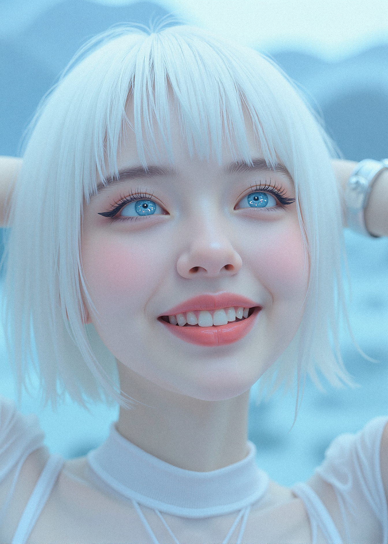 A hyper-realistic close-up of a short haired woman with icy white hair and pale, flawless skin. Her eyes are bright light blue, almost glowing, with digital patterns reflecting in them. Her lips are a deep red, glossy and perfectly shaped. The background is an abstract, digital landscape, with soft gradients and blurred shapes, creating a dreamy, otherworldly atmosphere. realistic shine to the hair, with soft highlights following the natural flow and texture. Add subtle variations in color and thickness for a more dynamic look. soft, glossy texture to the lips, with realistic reflections and subtle texturing to emphasize the natural folds and curves. intricate details to the eyes, with a reflective, slightly glossy sclera and subtle shading to create depth. a delicate eyeliner with a soft wing, blending gently into the lash line to enhance the eyes without overpowering the natural beauty. Leaning back with her arms crossed behind her head, looking up with a wide smile.