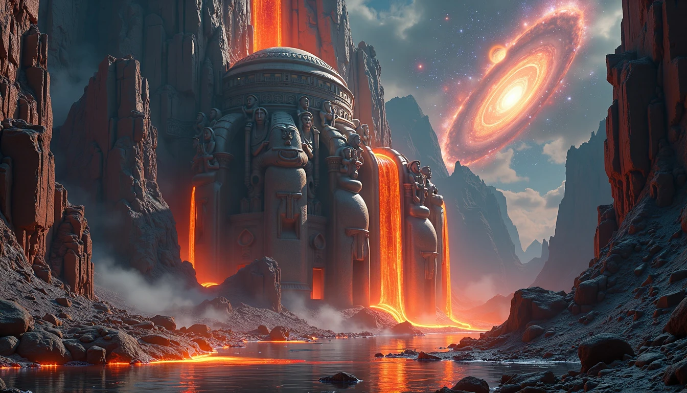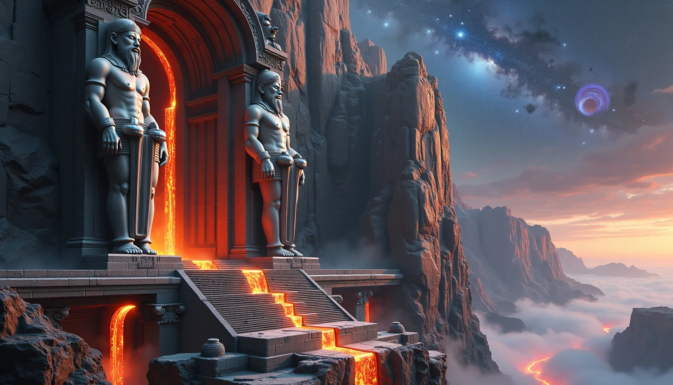 Photorealistic view of a colossal temple carved into the side of a towering cliff, with gigantic godly figures made of stone and metal emerging from the rock, holding up the temple with their immense strength, rivers of molten lava flowing down the cliffside, night sky with nebulae, supermassive black hole in the sky. Deep depth of field. Amazing !