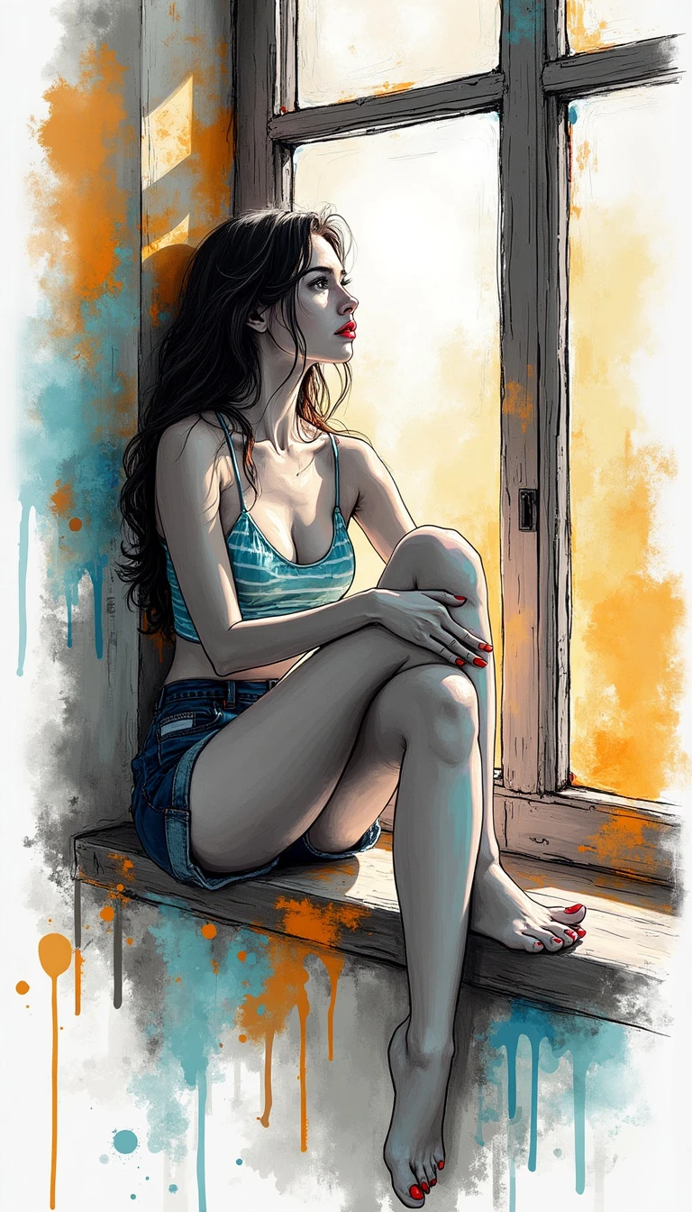 black pen drawing style, sketch, beautiful woman, full body sketch, sitting on a windowsill, looking out a window, splash of color,