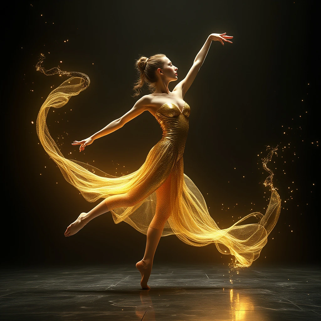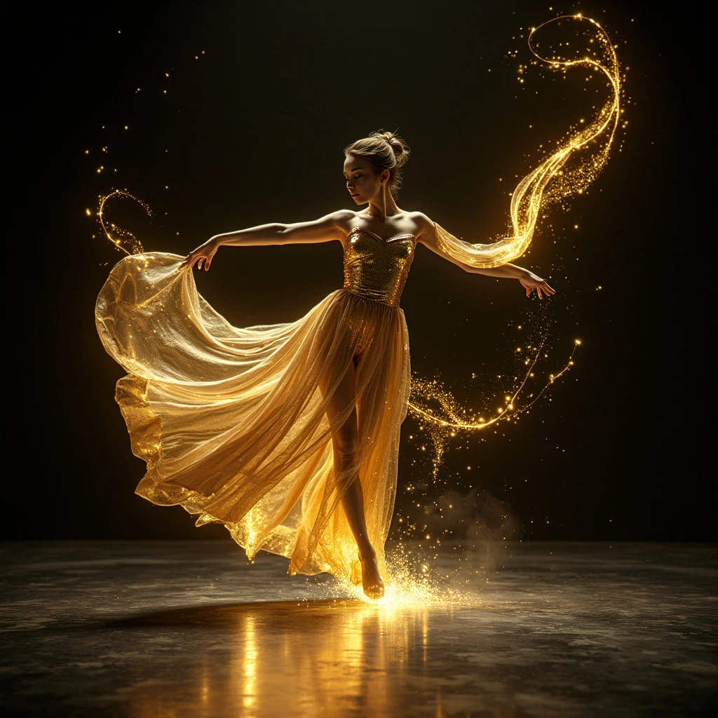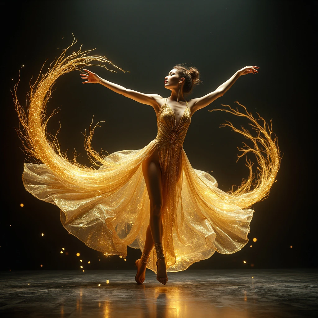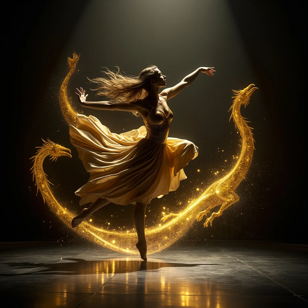 **Poster Prompt for Text-to-Image Generator:** - **Scene Setting**: A completely black stage with a subtle, glossy reflective surface, as if polished obsidian. The stage is dark except for a single spotlight that illuminates the dancer. The background should remain entirely black, with no visible props or elements to maintain focus on the dancer and light trails. - **Dancer's Appearance**: The dancer is a female figure, mid-motion in a graceful pose, mid-leap or spin. She is clad in a flowing, form-fitting gold costume that appears to be made of metallic fabric. The gold should have a mirror-like sheen, reflecting the light in a realistic way, creating highlights and deep shadows on her body. - **Dancer's Movement**: The dancer's movements should be captured in a way that feels fluid and dynamic. Her limbs create arcs and curves in the air, leaving behind trails of shimmering golden light. These trails should be semi-transparent, glowing softly, and should appear to dissipate gradually into the darkness. - **Golden Light Trails**: The light trails left by the dancer’s movements should form the shapes of mythical creatures like dragons, phoenixes, or griffins. Each creature should be made of soft, glowing golden light—detailed but still abstract enough that they blend back into the trails. The creatures should appear to be mid-motion, as if flying or emerging from the dancer's movements. They should gradually dissolve into the background as they extend away from the dancer. - **Lighting**: The main source of light comes from a single spotlight above the dancer, casting soft, diffused golden light. This light creates subtle reflections on the glossy black stage beneath her and highlights the metallic sheen of her costume. The light should create deep, dramatic shadows, emphasizing her form and the surreal nature of her movements. - **Overall Atmosphere**: The image should have a surreal and ethereal quality with high contrast between the glowing gold elements and the deep black background. The viewer’s eye should be drawn to the dancer’s form and the golden trails, which should feel almost otherworldly.