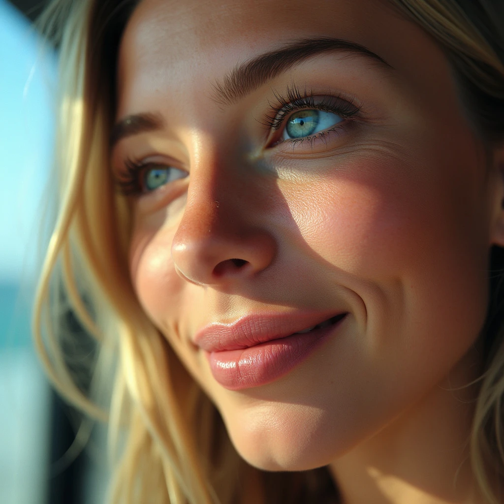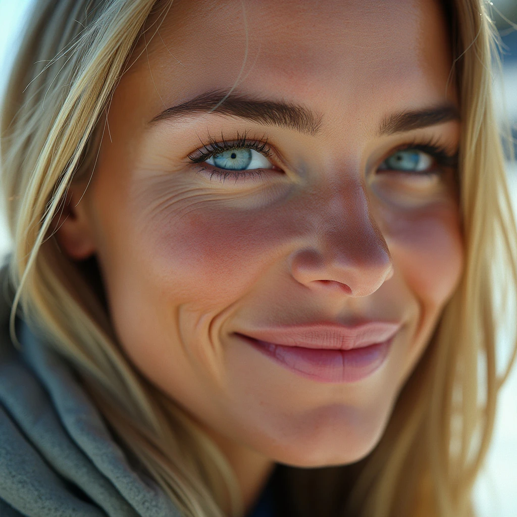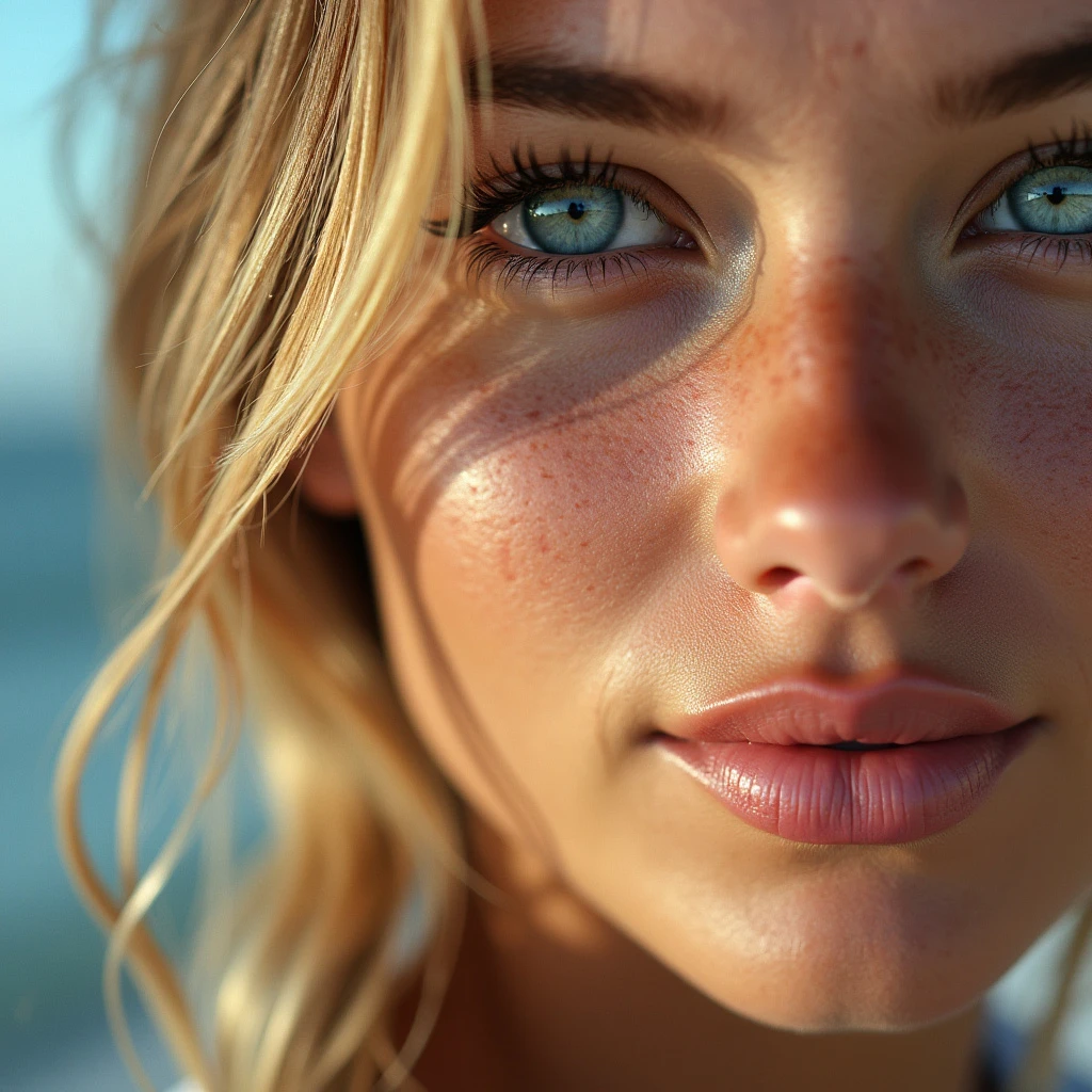 A hyper-realistic close-up shot of a woman’s face, emphasizing her left eye, cheek, and lips. The woman is tall (about 1.75 meters) with a sporty and slender build. She has natural blonde hair that falls to her shoulders and glacier-blue eyes. Her left eye is a striking light green color, and her lips are soft pink, slightly parted. Her skin has a natural tan, reflecting her love for the outdoors. The lighting accentuates her facial features, revealing the texture of her skin. The image captures her head slightly turned to the right, and her expression conveys warmth and vibrance.