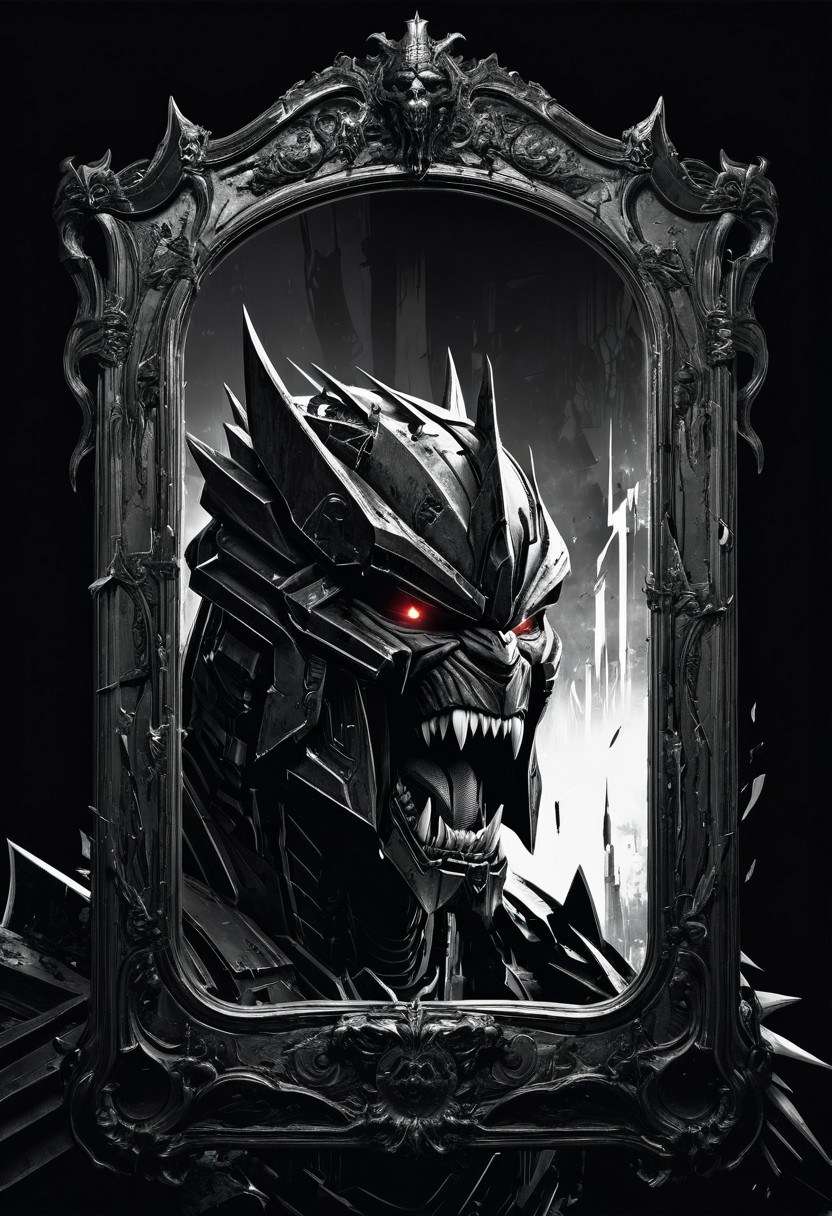 Dark fantasy illustration. Fantasy concept art. Monochrome image, scary, Megatron screams silently inside an old broken mirror, disturbing atmosphere, dark light
