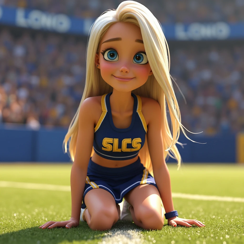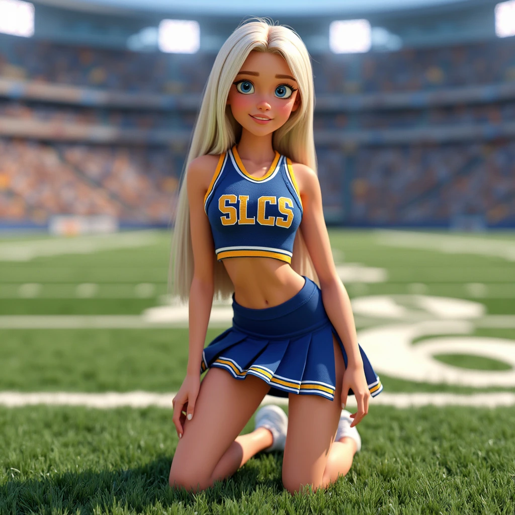 Disney Pixar 3d animated movie character. Real 3d style. Pretty blonde woman, long straight platinum blonde hair, blue eyes. Pale white skin. Beautiful gorgeous stunning. Relaxed facial expression. Cheerleader uniform in blue and gold. Cropped sleeveless top with the letters SLCS. Pleated skirt with side slits and gold stripe. White sneakers. Kneeling up on grass in a football stadium.