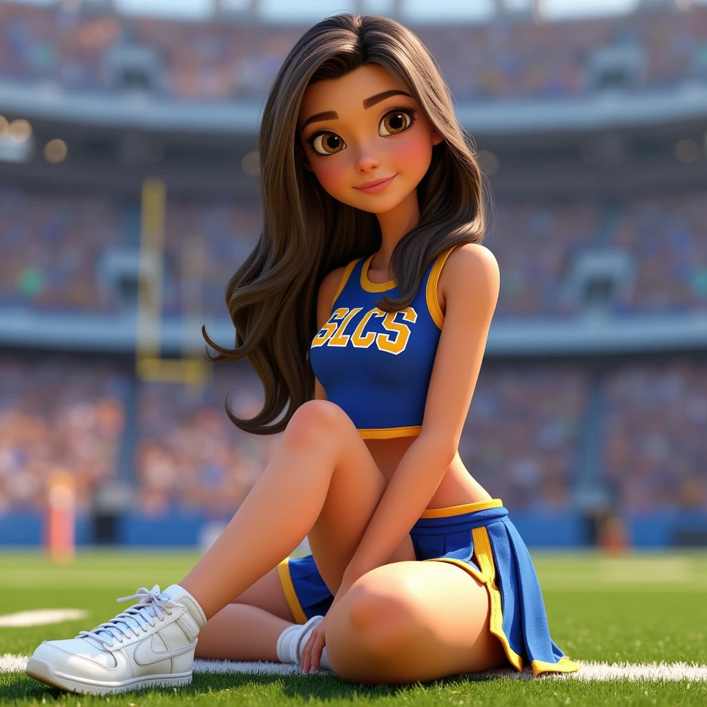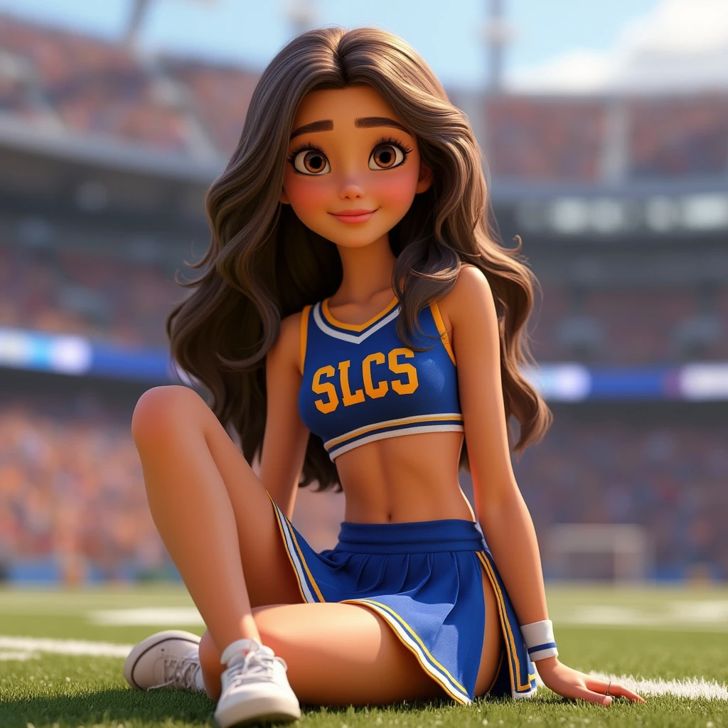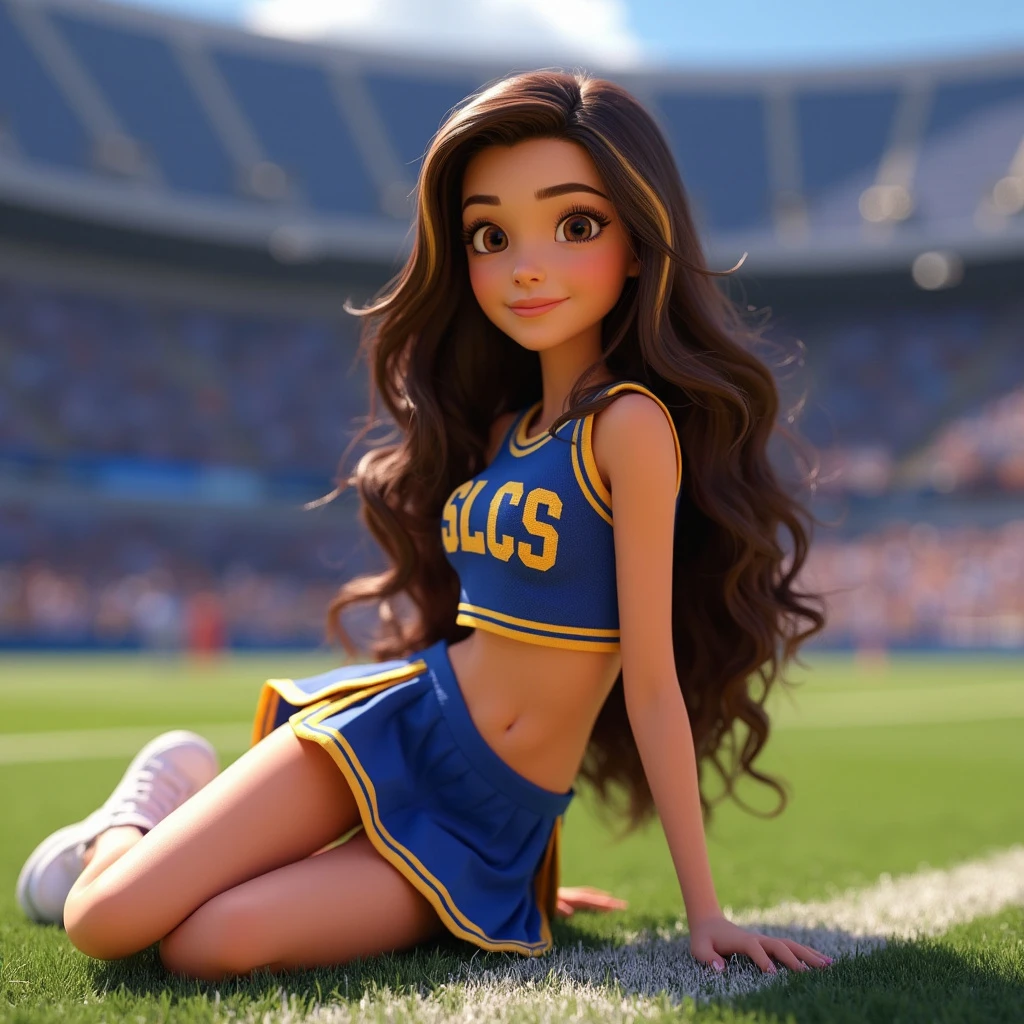 Disney Pixar 3d animated movie character. Real 3d style. Pretty brunette woman, long wavy brown hair with highlights, hazel eyes. Pale white skin. Beautiful gorgeous stunning. Relaxed facial expression. Cheerleader uniform in blue and gold. Cropped sleeveless top with the letters SLCS. Pleated skirt with side slits and gold stripe. Wearing white sneakers on her feet. Sitting on grass in a football stadium. Eyes looking directly at the camera.