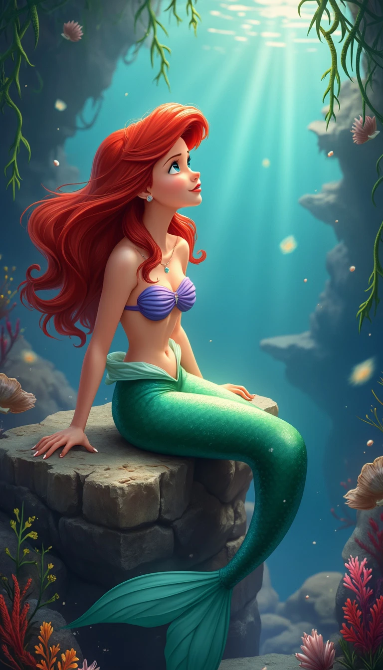 Subject: Ariel, the Little Mermaid, as the main character Lighting: Soft, warm, and dreamy underwater lighting with a subtle glow, evoking a sense of enchantment and wonder Action: Ariel sitting on a rock or a shell, looking longingly up towards the surface, with her iconic red hair flowing in the water currents Setting: An underwater kingdom, with subtle hints of coral, seaweed, and oceanic textures in the background, conveying a sense of depth and mystery Details: Ariel's tail is a shimmering, iridescent green, with subtle scales and a delicate fin She is surrounded by a few strategically placed seashells, pearls, or other oceanic treasures Her facial expression is a mix of determination and wistfulness, conveying her desire to explore the world above Her hair is adorned with a few strategically placed seaweed strands or ocean flowers Mood: Whimsical, romantic, and slightly melancholic, capturing the essence of Ariel's longing for a life beyond the sea With this optimized prompt, the AI image generator can create a stunning digital art image that captures the essence of The Little Mermaid's story, with a beautiful and dreamy underwater setting, a captivating subject, and a sense of wonder and enchantment. Create a digital art image of a book cover for The Little Mermaid, featuring Ariel sitting on a rock or shell, looking longingly up towards the surface, with soft, warm, and dreamy underwater lighting. The background should have subtle hints of coral, seaweed, and oceanic textures, conveying a sense of depth and mystery. Ariel's tail should be a shimmering, iridescent green, with subtle scales and a delicate fin. She should be surrounded by a few strategically placed seashells, pearls, or other oceanic treasures, with her hair adorned with seaweed strands or ocean flowers. The mood should be whimsical, romantic, and slightly melancholic, capturing Ariel's desire to explore the world above. The image should be highly detailed, with a sense of wonder and enchantment.