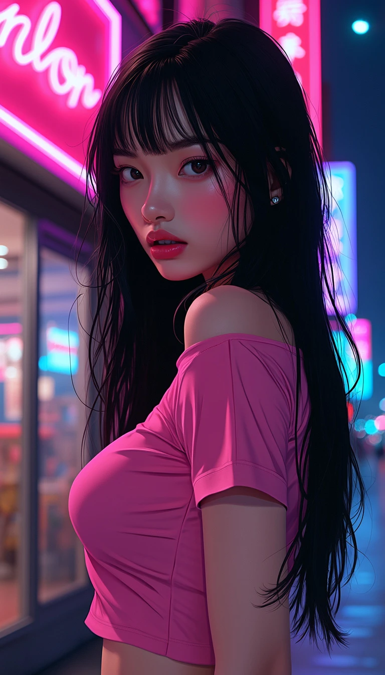 Subject: A stylish and enigmatic woman with straight black hair, light complexion, and rosy cheeks, exuding a sense of independence and curiosity. Lighting: Vibrant, neon-lit urban setting at night, with a strong color contrast featuring pink, blue, and purple hues dominating the background, casting a soft, mesmerizing glow on the subject. Action: The woman is turned slightly to her right, glancing back over her shoulder, conveying a sense of introspection and subtle movement, as if she's about to step into the vibrant city nightlife. Setting: A bustling, cosmopolitan cityscape at night, with buildings, windows, and a glowing storefront in the background, evoking a sense of energy, dynamism, and urban sophistication. Details: The woman's expression is sensual but engaged, with large eyes and subtly arched eyebrows, adding to her enigmatic charm. She wears a sleek, modern Pink top with short sleeves, which complements her dark hair and light complexion. The background neon lights create a soft, ethereal glow, suggesting a lively, nighttime city atmosphere. Mood: The image should convey a sense of independence, curiosity, and subtle introspection, with a touch of urban sophistication and glamour. The color palette should be bold and vibrant, with a focus on pink, blue, and purple hues to create a mesmerizing and captivating atmosphere. Style: The image should have a stylized, illustrative quality, with bold lines, vibrant colors, and a mix of digital and hand-drawn elements, evoking a sense of modernity and fashion.