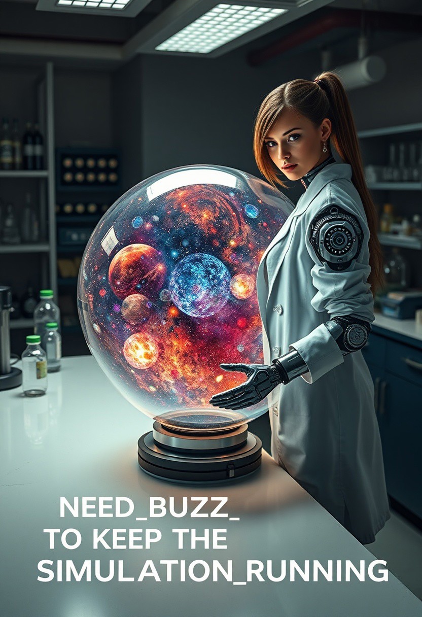 Laboratory, table, big glass orb on the table, orb contains universe, cyborg, science fiction, cyberpunk, beautiful female cyborg, lab coat, text cloud "NEED_BUZZ_TO KEEP_THE_SIMULATION_RUNNING".