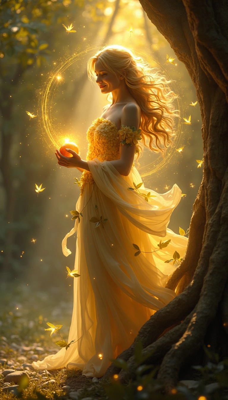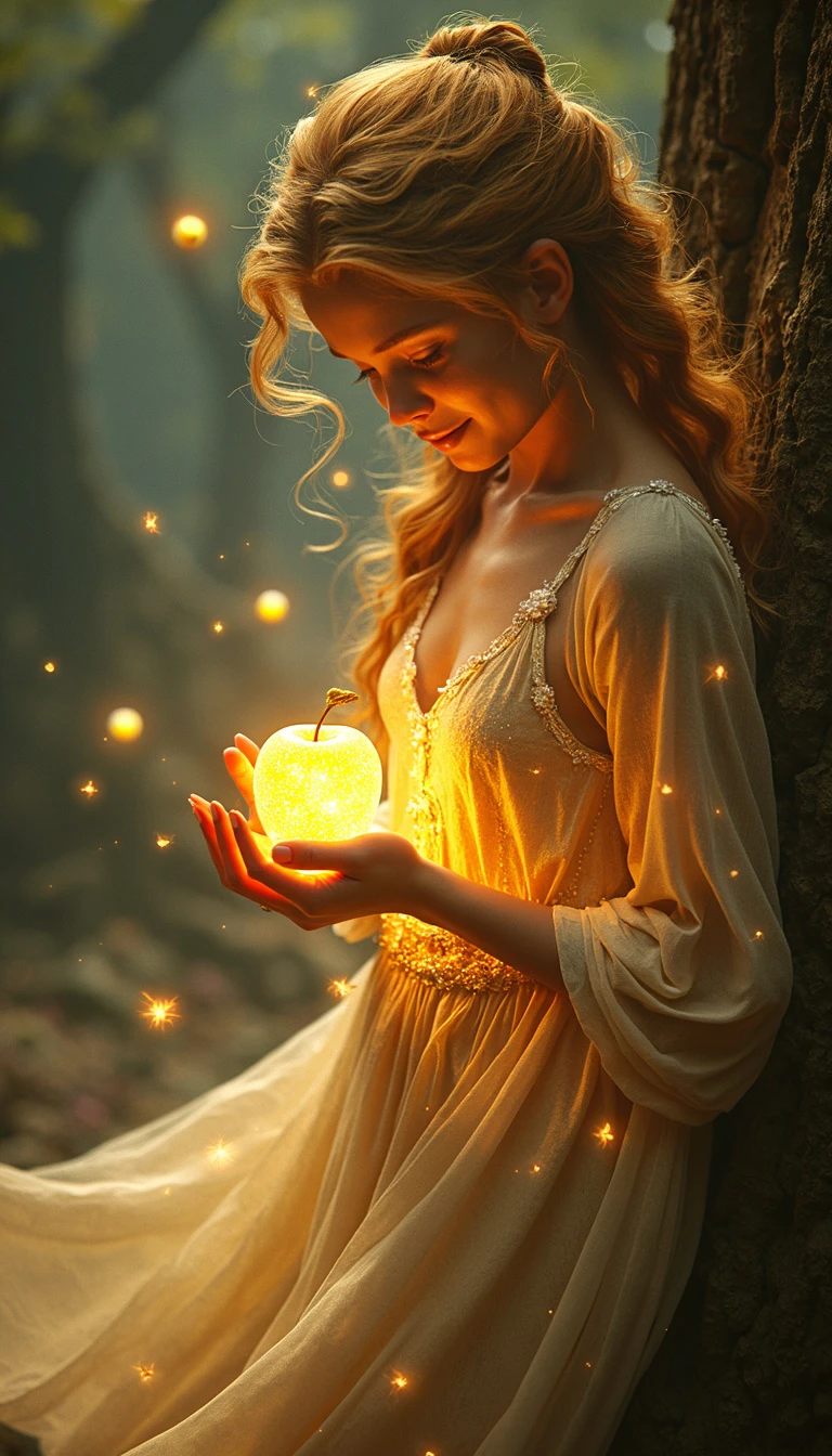 An ultra-realistic, cinematic half-body portrait of Idun, the radiant Norse Goddess of Youth and Renewal. She stands in an eternal twilight, her body surrounded by a swirling mist that glows with a soft, golden light. In her hands, she cradles one of her famous golden apples, which emits a brilliant, pulsating light that seems to push back the encroaching darkness. Idun's youthful face is lit with a serene smile, her eyes sparkling with the light of eternal spring. Her hair, the color of ripening wheat, flows around her in impossible curls, each strand seemingly lit from within and leaving trails of light as it moves. She wears a dress woven from new spring leaves and apple blossoms, each leaf edge rimmed with a soft, bioluminescent glow. Orbiting around her are ghostly images of the other Norse gods, each visibly aging until they bite into spectral versions of her apples, instantly rejuvenating in a burst of golden light. The background transitions from the gnarled roots of Yggdrasil below to its vibrant canopy above, with Idun standing at the threshold between death and rebirth. Technical Details: Rendered in a style that combines the Pre-Raphaelite romanticism of John William Waterhouse, the luminous nature paintings of Thomas Kinkade, and the fantasy realism of Brian Froud. The lighting is ethereal and multi-layered, with the primary source being the golden apple in Idun's hands, complemented by her inner glow and the bioluminescent elements of her dress. Advanced particle systems create the swirling, glowing mist and the rejuvenation effects of the spectral apples. A custom "living light" shader gives Idun's hair and dress their unique, internally lit quality. The Yggdrasil background uses advanced tree rendering techniques to create a sense of immense scale and age.