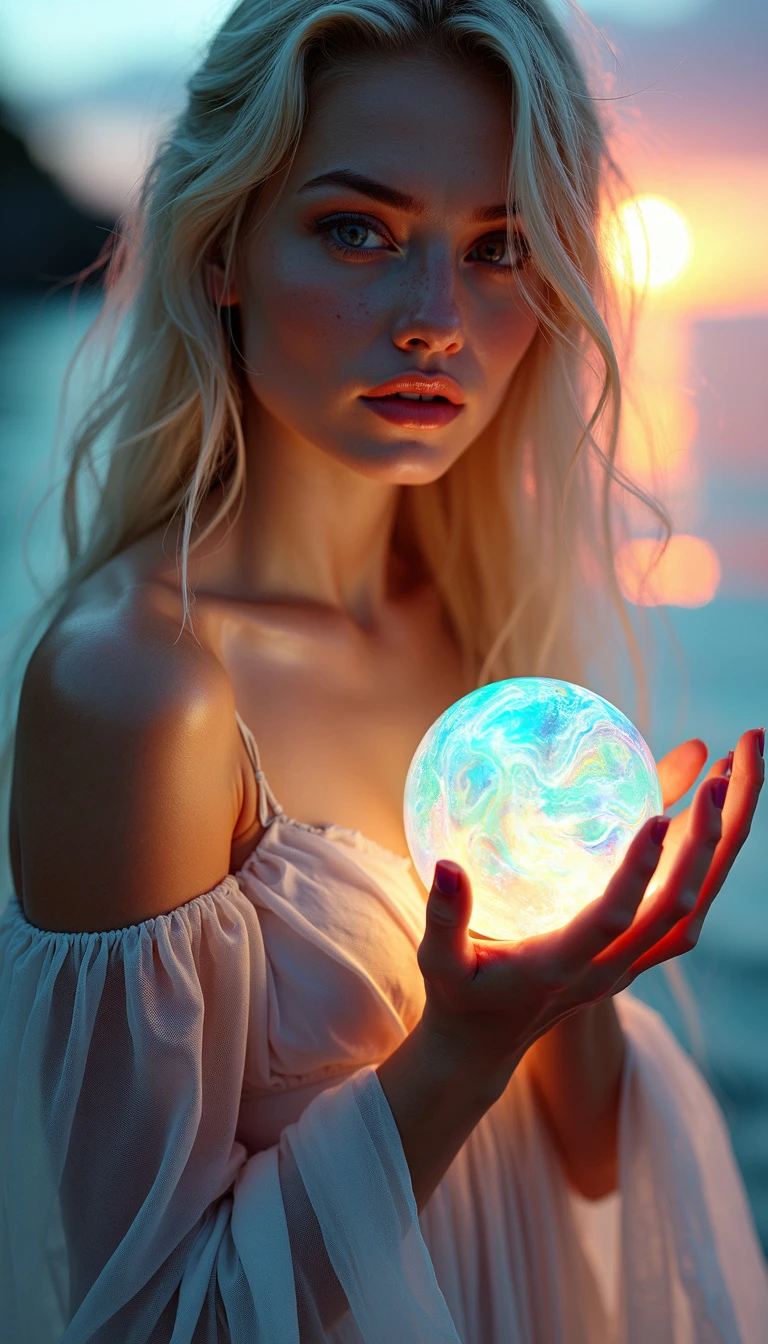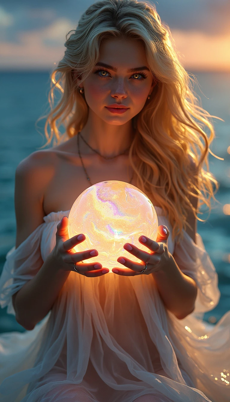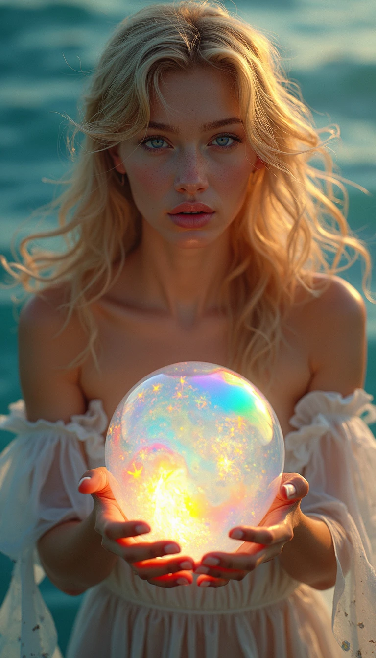 An ultra-realistic, cinematic half-body portrait of Aphrodite, the mesmerizing Greek Goddess of Love and Beauty. She emerges from an iridescent seashell, her skin radiating a soft, mother-of-pearl luminescence. Her hands cup a sphere of swirling, opalescent foam that casts a rainbow of colors across her features. She wears a diaphanous chiton that seems woven from sea mist, catching and refracting light in ever-changing patterns. Aphrodite's hair flows in golden waves, each strand shimmering like sunlight on water. Her eyes sparkle with an otherworldly allure, reflecting the myriad colors of her foam sphere. A gentle aura of rose-gold light surrounds her, pulsing softly like a heartbeat. The background transitions from the deep azure of the Mediterranean to the warm pinks and oranges of a sunset sky, all infused with a soft, diffused glow. Technical Details: Rendered in the style of William-Adolphe Bouguereau's classical idealism, combined with the light mastery of Ivan Aivazovsky's seascapes and the ethereal glow of digital artist Ross Tran. The lighting is multi-layered and dynamic, with the primary source being the opalescent foam in Aphrodite's hands, complemented by her inner luminescence and the sunset backdrop. Advanced subsurface scattering techniques create the translucent quality of her skin, while a custom "sea-light" shader generates the ever-changing patterns on her chiton. HDR rendering captures the full spectrum of light, from the subtle glow of her skin to the intense refractions of the foam sphere.