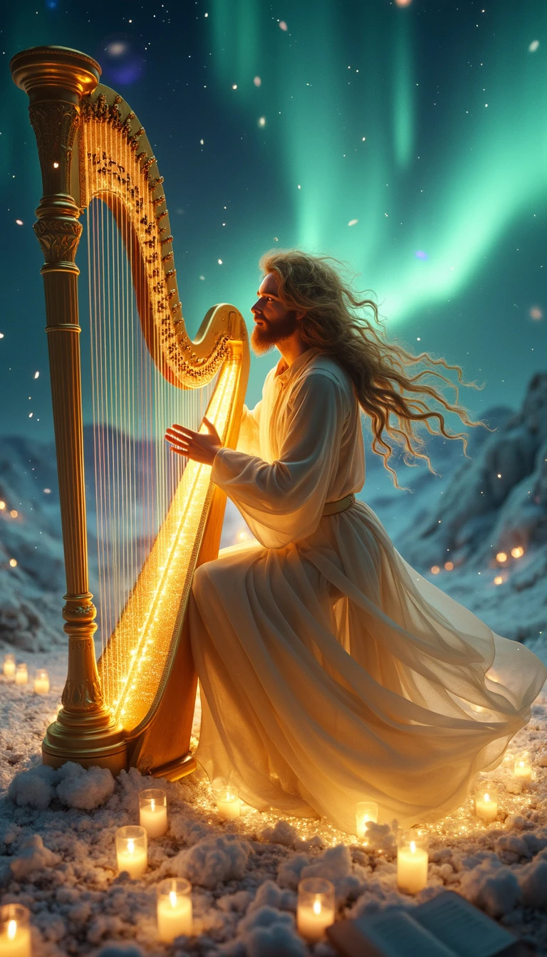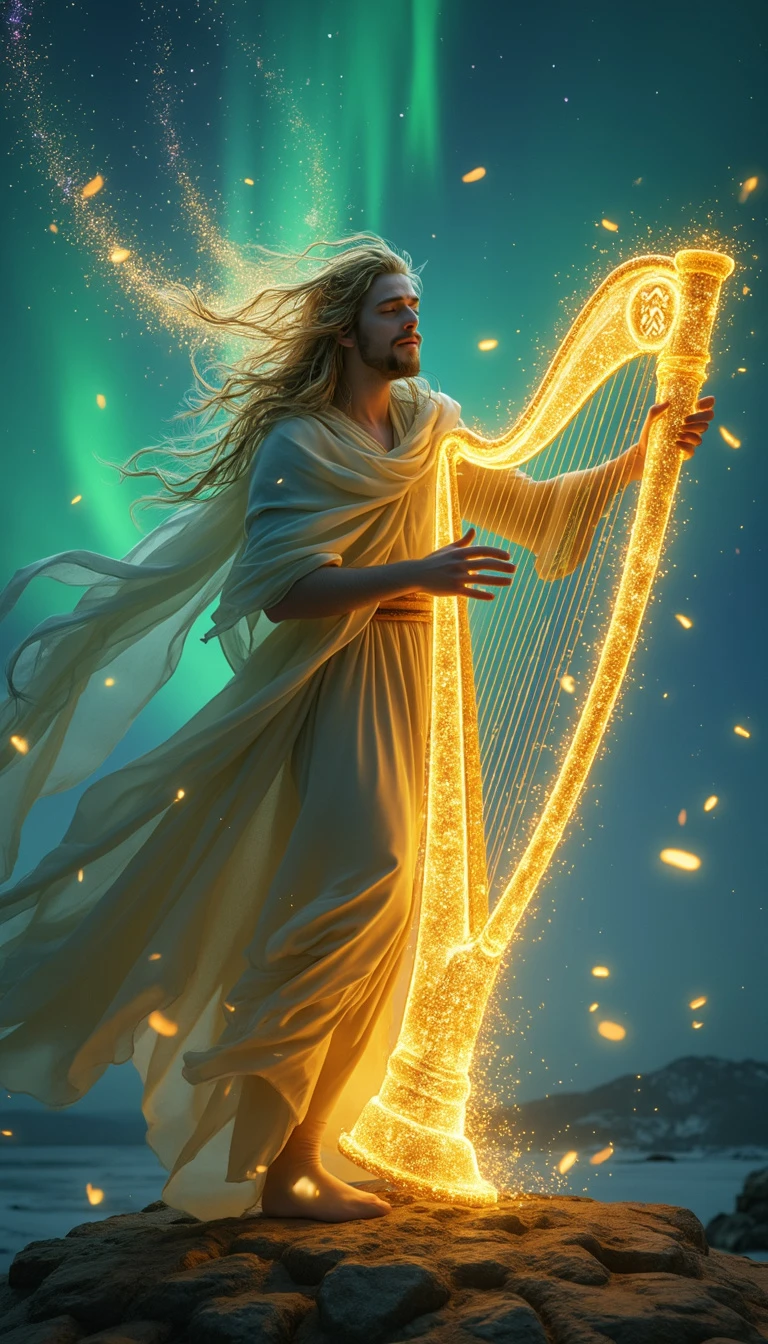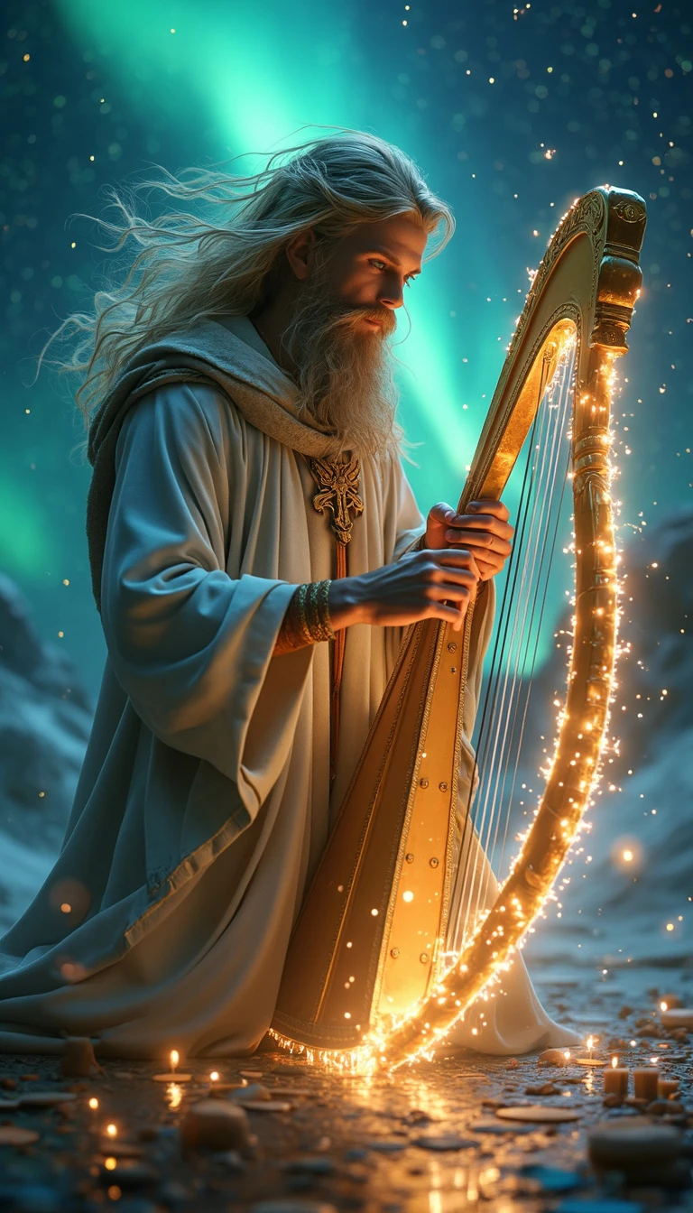 An ultra-realistic, cinematic half-body portrait of Bragi, the eloquent Norse God of Poetry and Music. He is depicted in a moment of divine inspiration, his form illuminated by the swirling lights of the Aurora Borealis that seem to respond to his music. Bragi's youthful face is animated with the joy of creation, his eyes sparkling with rhythmic pulses of multicolored light that match the tempo of his song. His long hair and beard flow as if blown by a melodic wind, each strand a shimmering harp string that vibrates with otherworldly harmonies. In his hands, he holds a magnificent golden harp, its strings made of pure light that stretch into infinity. As Bragi plays, each note manifests as a burst of colorful, luminous mist that forms runic poetry in the air before dissipating. The runes linger just long enough to be read before transforming into new verses. Around him, ghostly images of ancient skalds and future poets fade in and out of existence, their forms composed of flickering candlelight. The ground at Bragi's feet is a mosaic of illuminated manuscripts, each one glowing softly with the light of preserved knowledge. Technical Details: Rendered in a style that combines the Art Nouveau elegance of Alphonse Mucha, the visionary art of Alex Grey, and the light sculptures of James Turrell. The primary light source is the responsive Aurora Borealis, with additional illumination from Bragi's harp strings and manifesting poetry. A custom "musical light" shader creates the effect of visible sound waves and transforming runic poetry. Advanced hair simulation techniques make Bragi's hair and beard move and shine like instrument strings. The ghostly skalds and poets use a combination of particle effects and dynamic lighting to create their flickering, candle-like appearance.