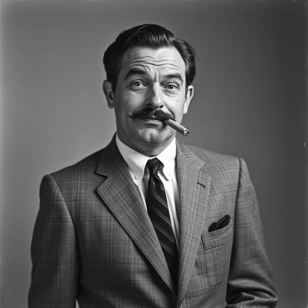 Black and white studio photo from the 1960s, full body photo, a smart 30-year-old man with a thin moustache, dressed in a 60s suit, a thin zigarillo in his mouth, posing