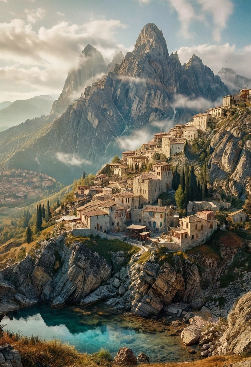 their peaks veiled in mist. mixed media, surrealism, great lighting, A surreal landscape highly detailed . extremely high-resolution details, appears trapped in an optical illusion of reflections and refractions colorful , mountains and village in Ancient Greece , professional photography, natural lighting, volumetric lighting maximalist. intricately detailed, complex, elegant, expansive, fantastical, film photography style, medium grain