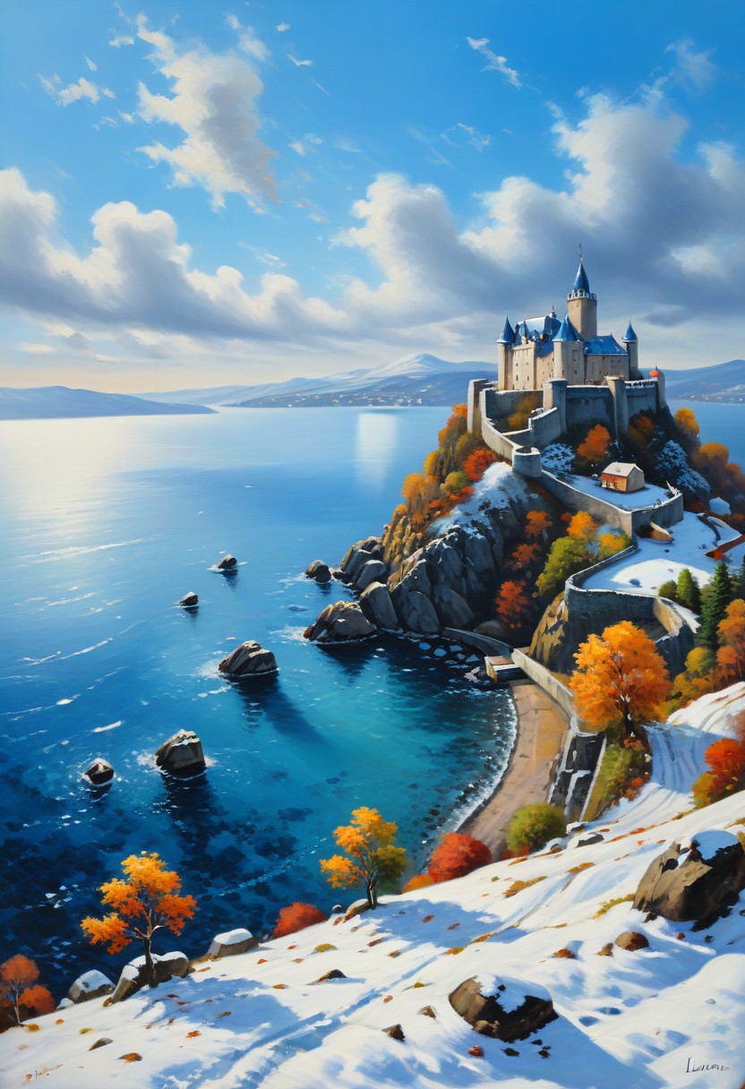 oil painting, a ultra detailed sea from a hill top, blue color sea, shining horizon, ultra detailed castle in the hill, made by stones, European style castle, autumn trees, ultra detailed snow falling in wind, Natural scenery, Fresh and clean, winter time, cold atmosphere<lora:xl_more_art-full_v1:0.3><lora:oil_SDXL_v1.0:0.8>