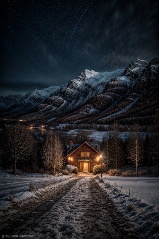(masterpiece, best quality, highres:1.2), otherwordly snowy landscape, eerie atmosphere, night sky, foggy,