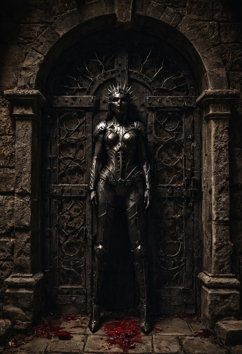 ((Medieval fantasy setting)), score_9, score_8_up, score_7_up, Iron Maiden: "A large metal sarcophagus in the shape of a woman, inside of which there are sharp spikes. On the door there are bloody marks, testifying to the terrible suffering of the victims. The background is a dark, stone room with torches that barely illuminate the space, adding an ominous atmosphere. "