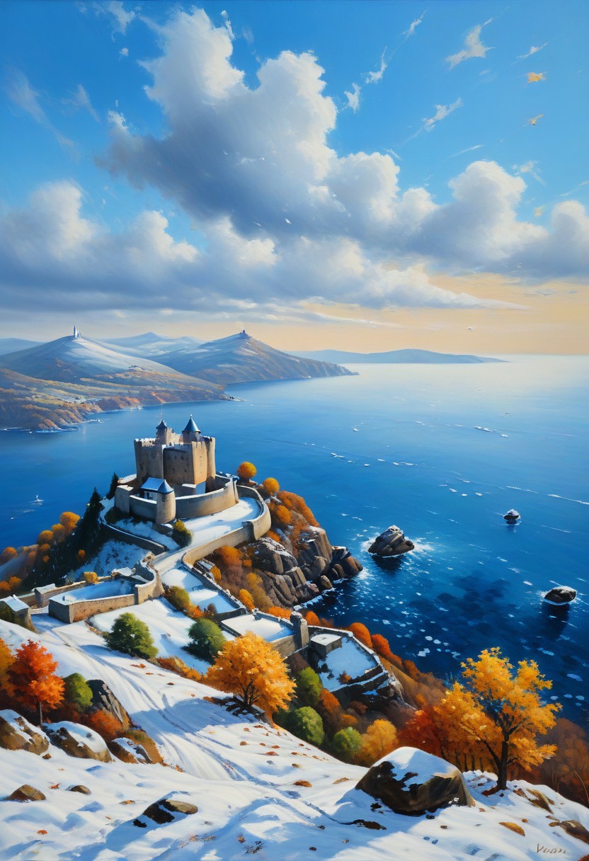 oil painting, a ultra detailed sea from a hill top, blue color sea, shining horizon, ultra detailed castle in the hill, made by stones, European style castle, autumn trees, ultra detailed snow falling in wind, Natural scenery, Fresh and clean, winter time, cold atmosphere<lora:xl_more_art-full_v1:0.3><lora:oil_SDXL_v1.0:0.8>