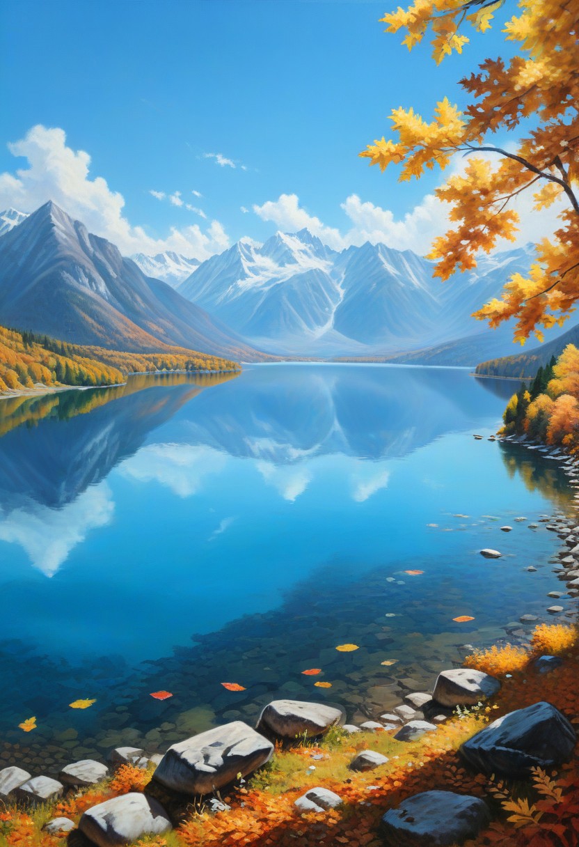 oil painting, a huge lake, crystal clear water, can see the bottom of the lake, Sky (blue), long view of snowy mountains, Natural scenery, Fresh and clean, autumn trees, ultra detailed leaves, leaves in the lake, Beautiful landscape, greenery, Sunlight, Warm atmosphere<lora:xl_more_art-full_v1:0.3><lora:oil_SDXL_v1.0:0.8>