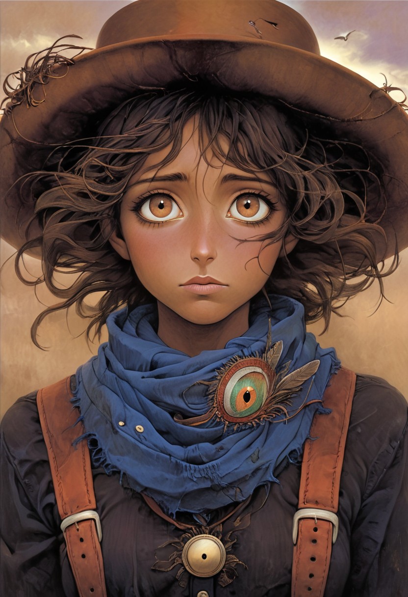 HDR photo of The image shows a young girl with large eyes and fair skin. She is dressed in a stylish, Western-inspired outfit, wearing a long-sleeved blue shirt with many buttons and brown suspenders. She has a scarf tied around her neck. On her head is a large wide-brimmed hat, decorated with a feather. Her hair is dark and slightly disheveled. The background of the image is neutral, with shades of beige and brown. 8k <lora:illustration:1> <lora:sdxl_lora_beksinski:1> <lora:SDXLrender_v2.0:1> . High dynamic range, vivid, rich details, clear shadows and highlights, realistic, intense, enhanced contrast, highly detailed