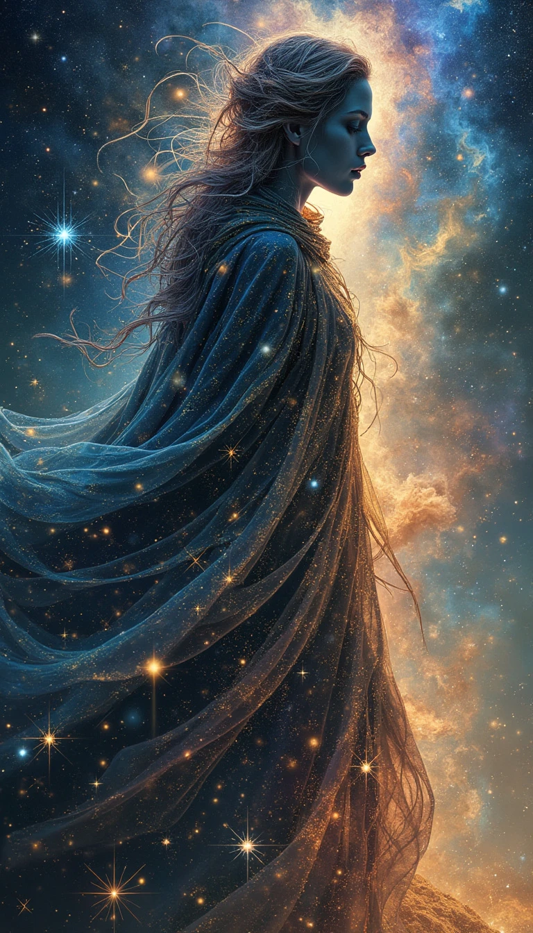 Fantastic myths of Vincent Castiglia: "Create an image of delicate shaped galaxies intertwined with cosmic fiber of a mysteriously ephemeral celestial wanderer, perfect and expressive face in double exposure, in a surreal tapestry in the universe, whose silhouette blends perfectly with the cosmic backdrop of swirling stars and galaxies. This conceptual artwork is a digital painting that features intricate detail and depth. The wanderer's iridescent cape glows with ethereal hues, every fold and curve illuminated by an otherworldly glow."