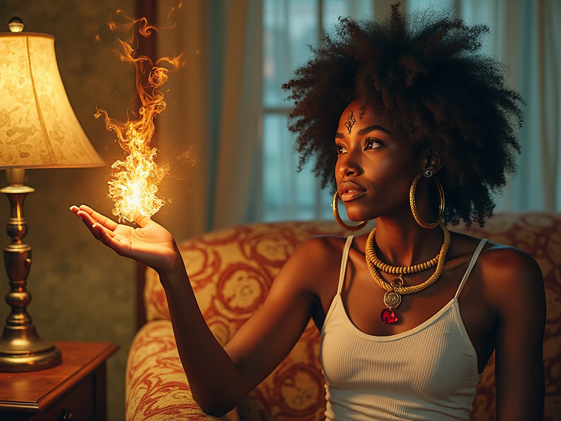 fractal Lichtenberg wood burning, she is of sub-Saharan descent, she has a medium dark skin tone, her eyes are dark brown, she has neutral lipgloss, she wears her black hair in a side-swept afro, she has large gold hoop earrings, she wears a white tank top, she has a double layer necklace made of rope with a red gem at the end of bottom layer, she is sitting on a couch with a 70s style pattern, she uses magical fire from her finger to light a lamp on the end table next to her, there is a delicate gold symbol on her forehead,