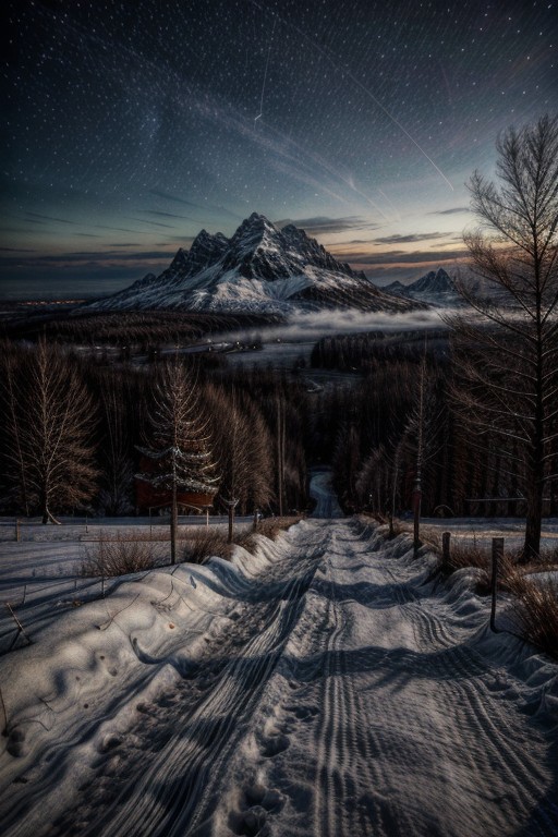 (masterpiece, best quality, highres:1.2), otherwordly snowy landscape, eerie atmosphere, night sky, foggy,