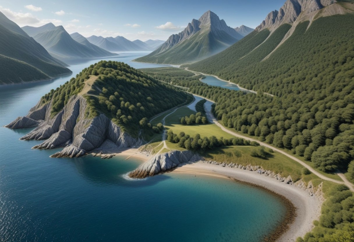 ultra-realistic image with high resolution and stable focus, correct and accurate anatomy, correct and accurate objects, perfect detail, ultra-realism, photo realism, on a natural landscape, sea, mountain, forest, river mouth, river flow into the sea