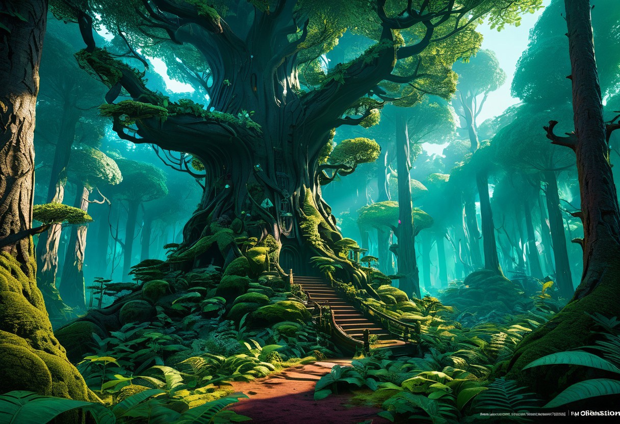 Fantasy concept art. intricate forest based on Life finds a ways maximalism, vibrant, complementary color scheme with NYX-like shadows. high-fantasy, mysterious, detailed, cinematic, trending on Artstation, Unreal Engine 5, 8k resolution, best quality.