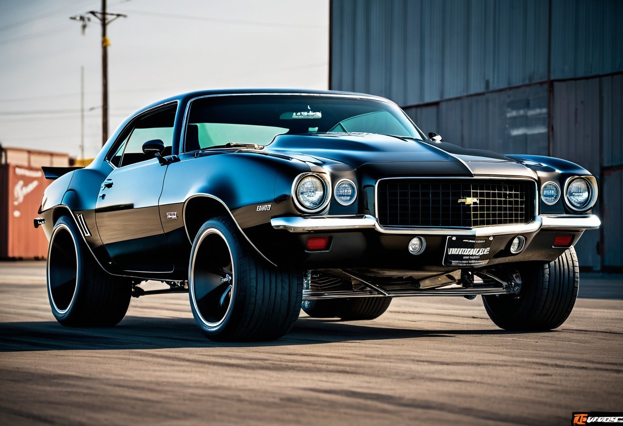 1970 Camaro low rider suspended in mid-air, front wheels hovering off the ground, scorching rubber and smoke surrounding the backend, sleek lines and chromed-out details reminiscent of Chip Foose's sleek yet rugged style, blended with the dark, surreal, and post-apocalyptic undertones of Zdzisław Beksiński, ornate textures and metallic sheen evoking a sense of heavy machinery, dramatic chiaroscuro highlighting the Camaro's curves and aggressive stance.