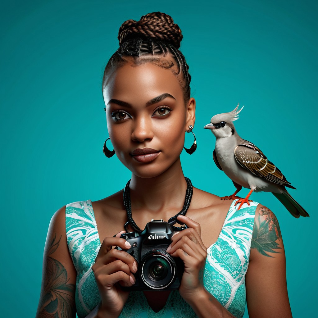 A confident, stylish woman with dark skin and intricate braids tied up into a high bun. She holds a professional camera with both hands, standing against a solid, bright turquoise background. She wears a white, patterned top, and her expression is calm and poised. There is a small tattoo of a bird in flight on her arm, adding a unique personal touch. The lighting is soft and even, emphasizing the glossy texture of her skin and the camera lens, creating a clean, professional portrait.