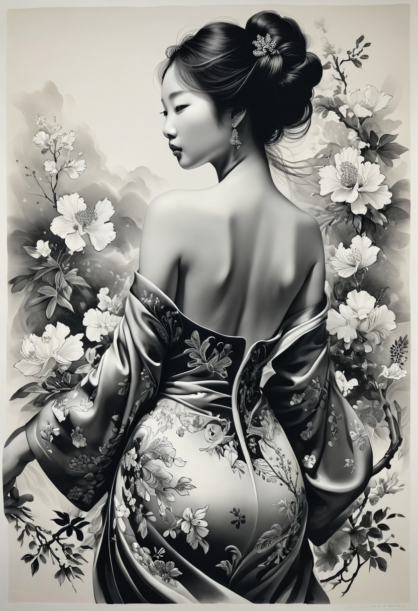 This artwork showcases Chinese black brush painting, inspired by the iconic style of Kazuki Takamatsu. The piece features loose compositions and exhibits the influence of Theodore Géricault, whose work often included expressive, gestural figures and compositions. Additionally, the artwork showcases tightly cropped compositions and incorporates elements of "letras y figuras," a Spanish art technique that combines calligraphy and figurative elements.