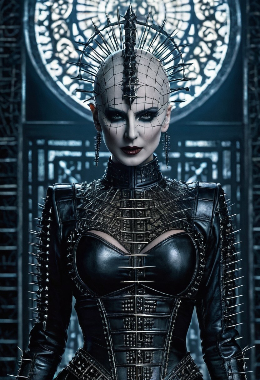 Pinhead Woman is a full-length Cenobite goddess, a cinematic, sci-fi, masterpiece, sinister, matte poster of the film "Hellraiser" popular on cgsociety, complex, epic, popular on artstation, from artgerm, highly appreciated detailed, vivid, cinematic rendering of characters, ultra-high quality model, detailed drawing of small details, 3D, octane number, detailed drawing of small details.