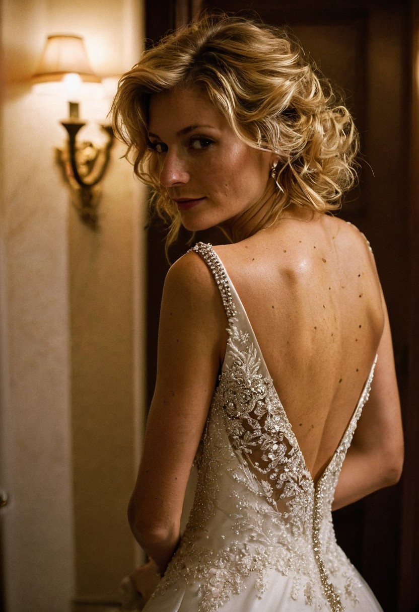 Stunning 35mm photo of a 42 years old Dutch woman, ((an breathtaking wedding dress)), back to camera, slowly undressing, striptease, very pretty, fit, skinny, highly detailed face, highly detailed skin, freckles, many freckles on arms and tits, freckles and moles all over body, natural breasts, perfect breasts, hard nipples, Rounded ass, blonde hair, pubic hair, short hair, messy hair, medium hair, brown eyes, highly detailed skin, highly detailed face, in love, happy, detailed pupils, in a very fancy hotel room, after the wedding, tired but laughing, in doorway of bathroom, seducing, slightly drunk, dark, night, low lights, soft natural light, Rembrandt style light, made with a Hasselblad camera, 35mm, film grain, masterpiece, sharp focus, shot on Kodak, lens flare, cinematic, (ultra high res: 1.2), (photo-realistic: 1.3) (skin pores: 1.1)