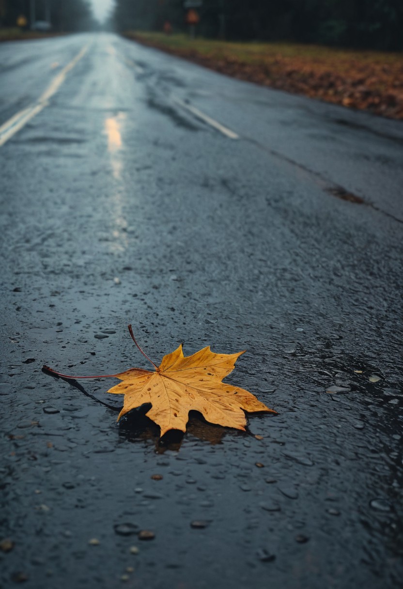 Single autumn leaf resting on a wet road, (ultra depth of field:1.3), (gloomy:1.2) and (melancholic:1.3) atmosphere, reflections in puddles, soft focus background, (overcast sky:1.1), capturing the essence of solitude, inspired by (Gregory Crewdson:1.4) and (Jeff Wall:1.3)