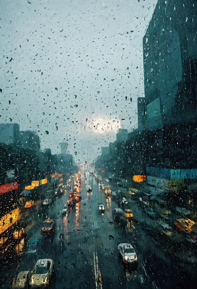 real image, view from inside window glass, raindrops onglass, a photograph of futuristic cyberpunk cityscape, heavy rain, neon advertisement board, wet road, fog, dark atmosphere, melancholic, fog, and the sun behind the fog.