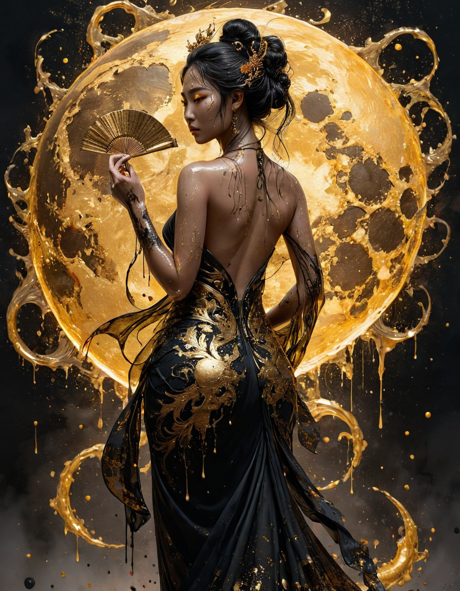 Full body back of an Asian goddess in a black dress with gold decorations. A dress with no flesh on the back, holding a fan in one hand. hyperdetailed eyes, Poster design, line art, a fantastically large moon background, ultra detailed artistic, detailed gorgeous face, natural skin, water splash, colour splash art, fire and ice, splatter, black ink, liquid melting, dreamy, glowing, glamour, glimmer, shadows, oil on canvas, brush strokes, smooth, ultra high definition, 8k, unreal engine 5, ultra sharp focus, intricate artwork masterpiece, ominous, golden ratio, highly detailed, vibrant, production cinematic character render, ultra high quality model <lora:add-detail-xl:1> <lora:Ausum:0.8> ausum style