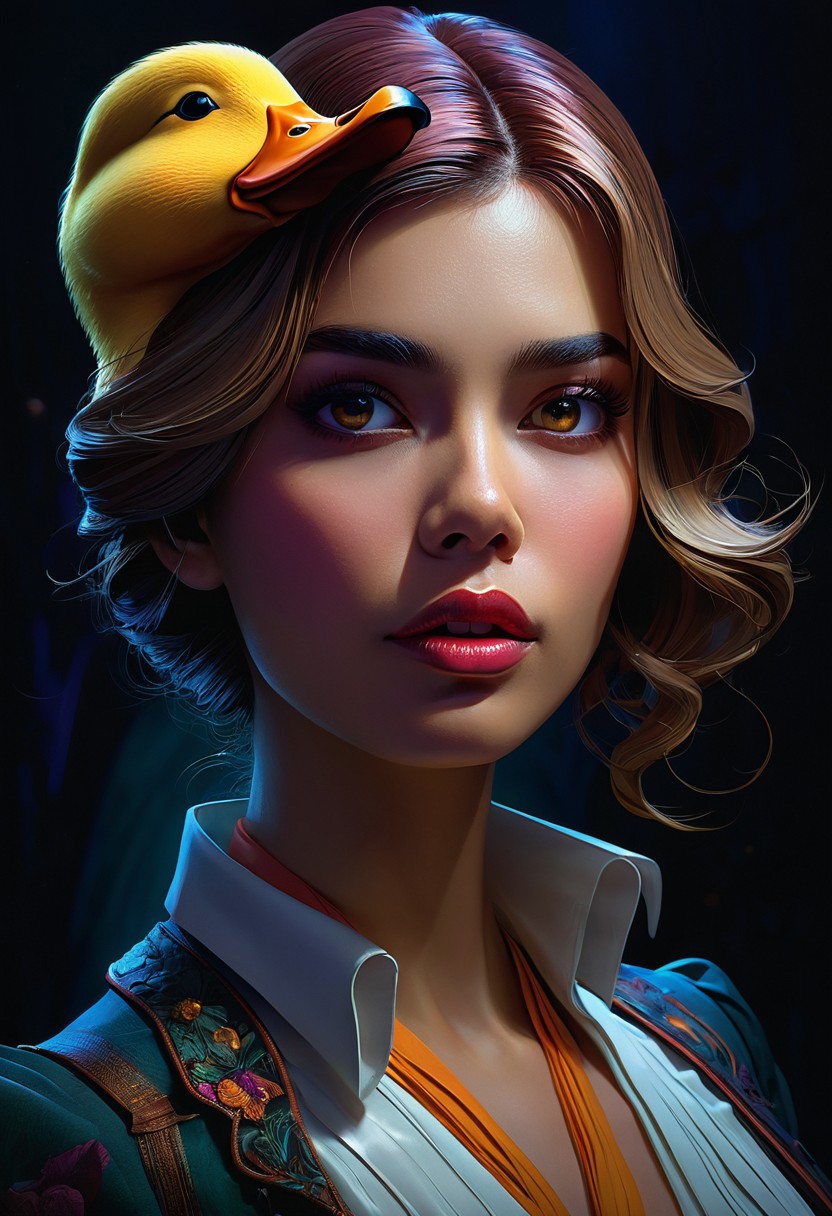 Expressionism - Horror illutration depicting digital illustration of wednesday duck, Hanna Barbara Pixar head and shoulders portrait, 8k resolution concept art portrait by Greg Rutkowski, Artgerm, WLOP, Alphonse Mucha dynamic lighting hyperdetailed intricately detailed Splash art trending on Artstation triadic colors Unreal Engine 5 volumetric lighting