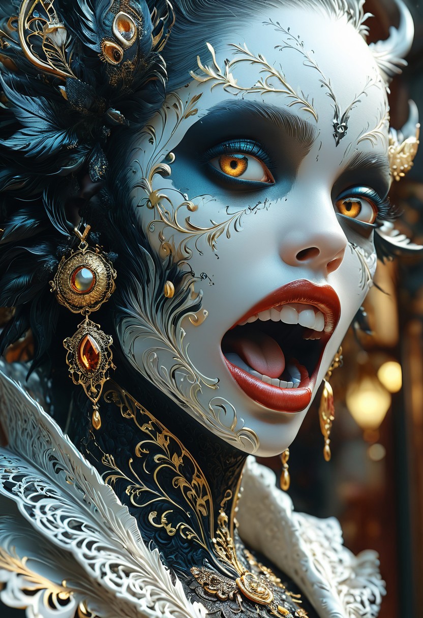 This captivating portrait, created by artists Karol Bak, James Jean, Tom Bagshaw, and inspired by Rococo, features a white-eyed, black-skinned monster with a mouth full of sharp fangs. The attention to detail and sharp focus make this piece stand out, as it trended on ArtStation. The cinematic lighting, hyper-realism, and Octane render contribute to the image's striking appearance. The 8K, ultra-detailed, and highly detailed portrait showcases vivid and hyper-detailed elements, making it an exceptional piece of art. The combination of these elements creates a visually stunning and thought-provoking image that is sure to captivate viewers with its extraordinary level of detail and artistic prowess.
