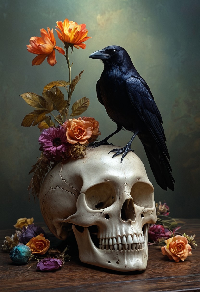 A crow sitting on a human skull, photorealistic , clear, colorful, ultra quality, 8k, best quality, masterpiece,midjourneyv6.1